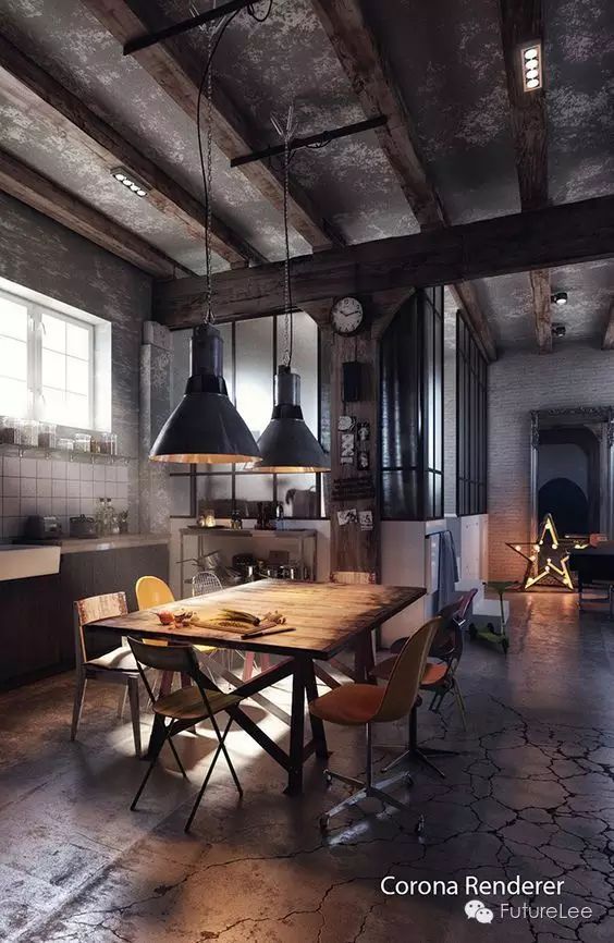loft工匠式的细节处理,粗犷的风格,原始的水泥墙面,是时下最受年轻人欢迎的风格,金属管制的吊灯散发的冷调中和了木质家具的复古。