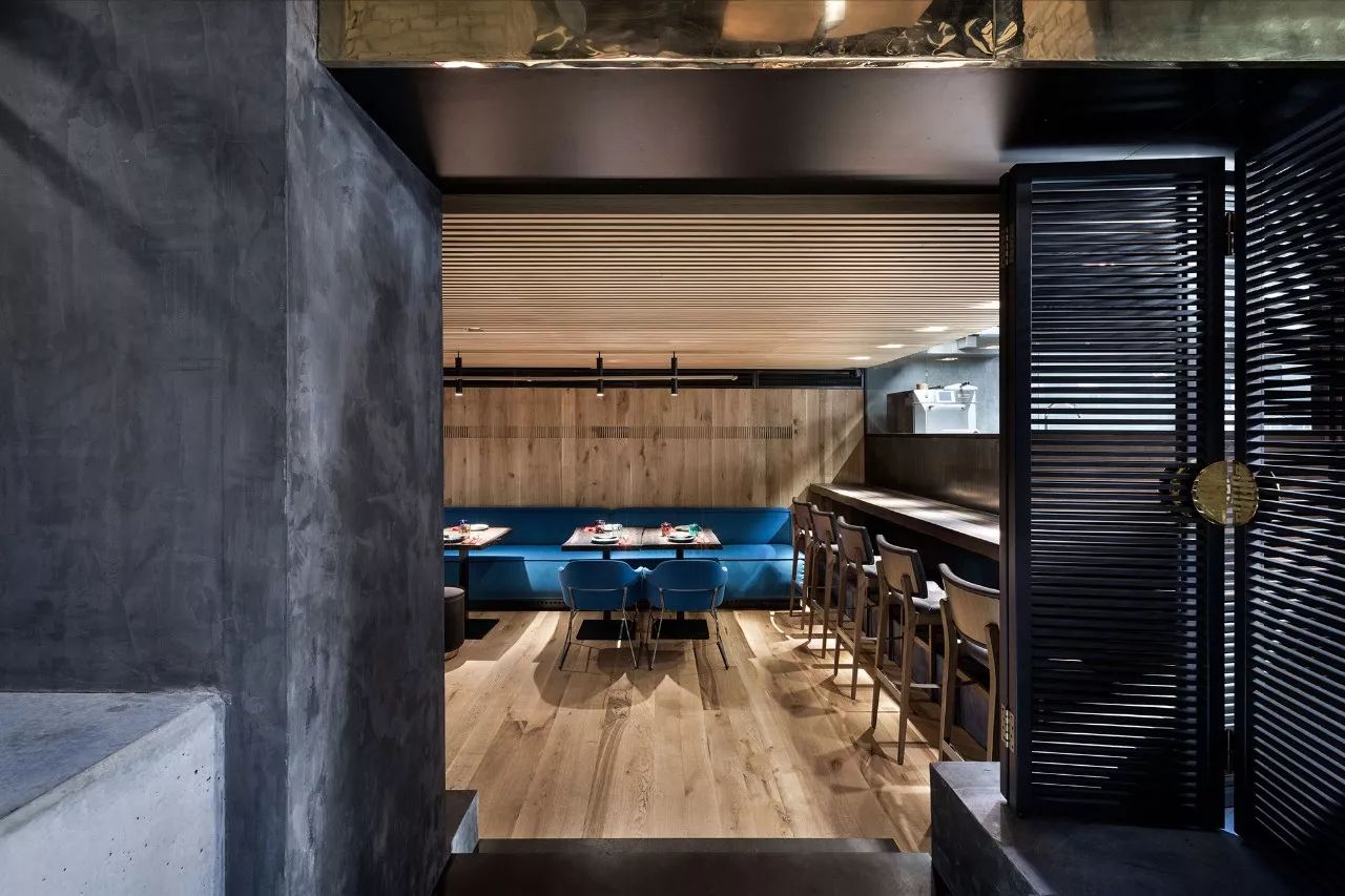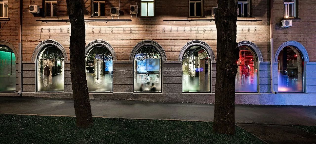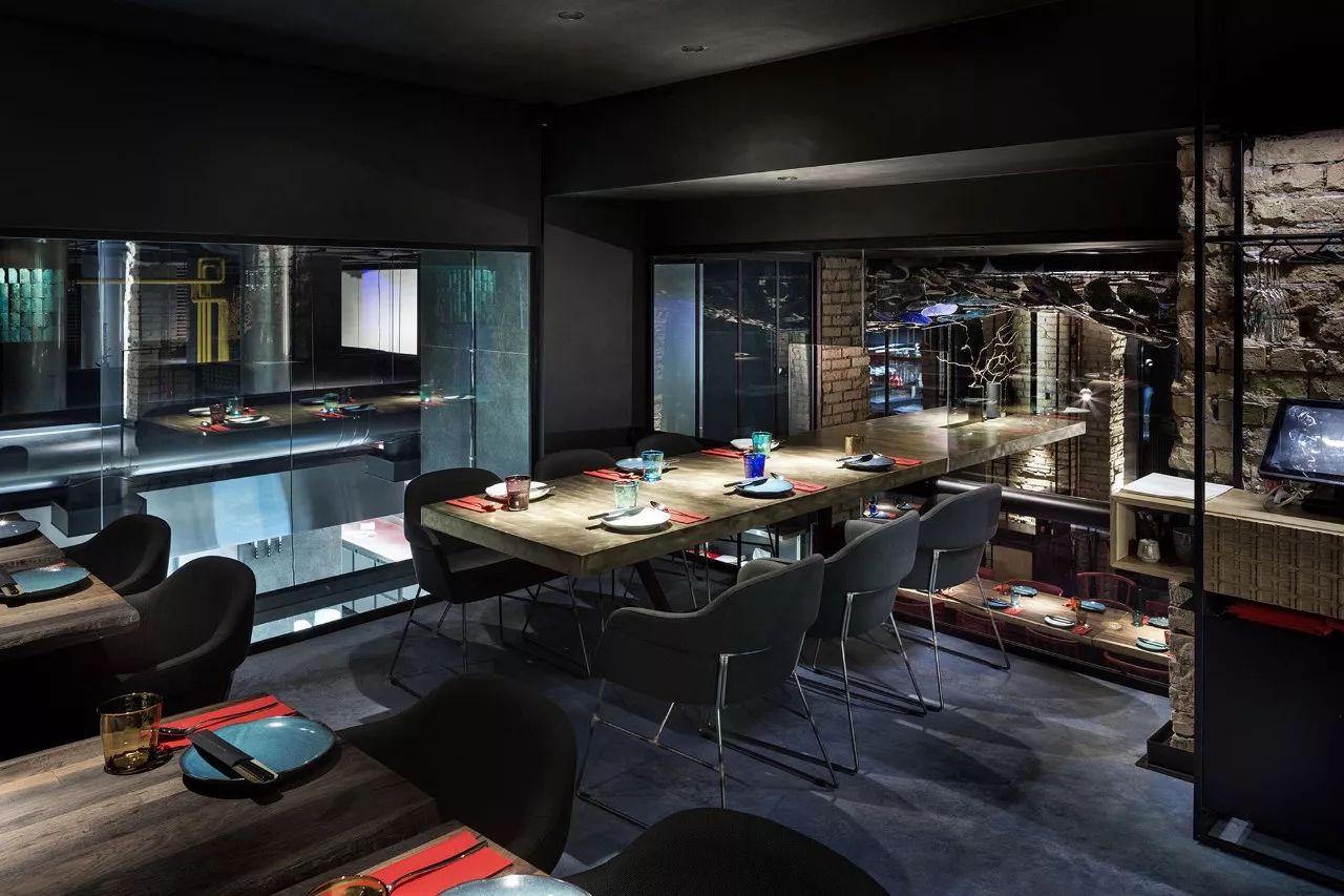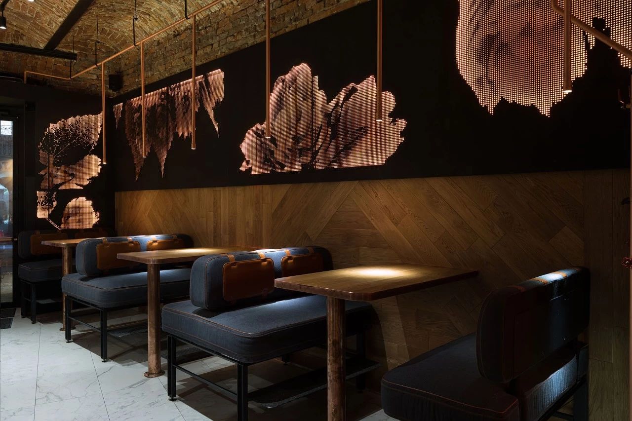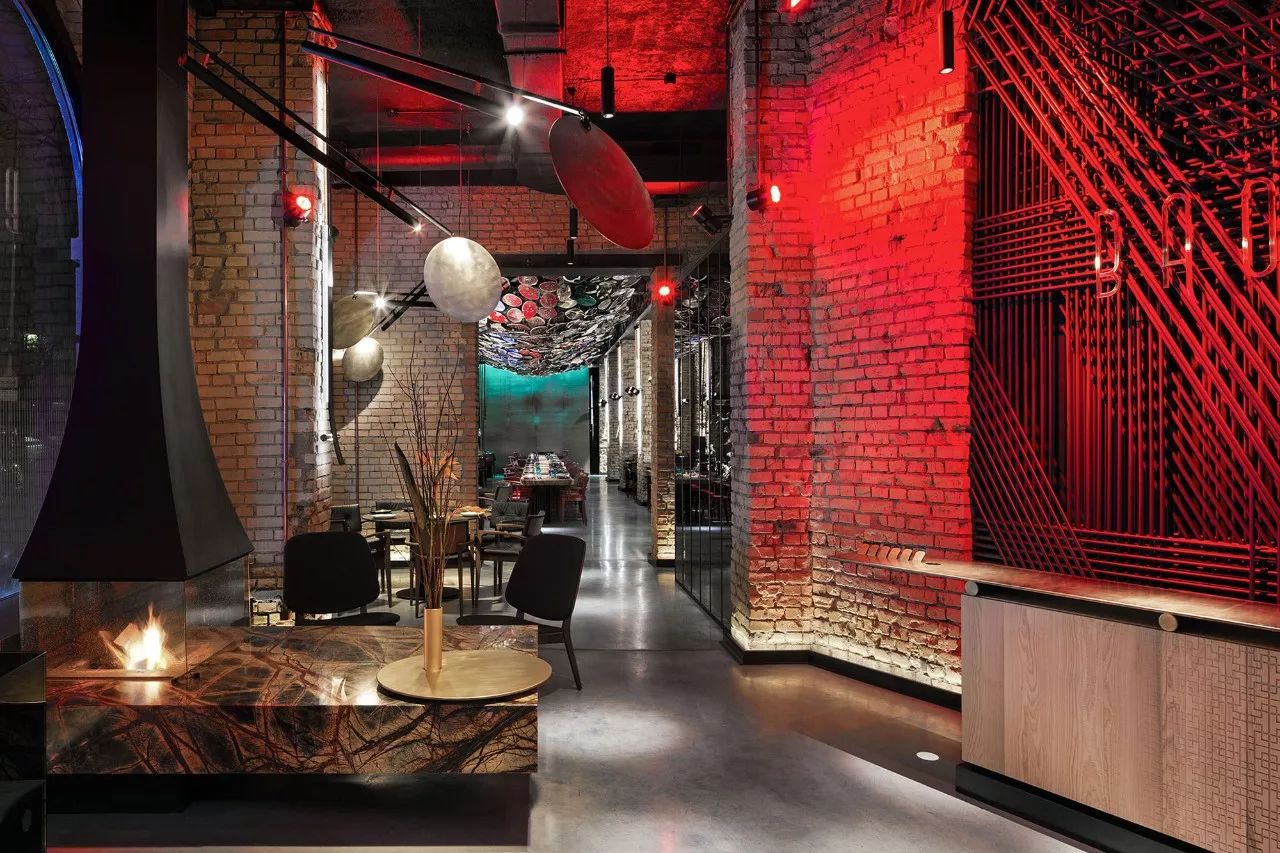 大厅中央是该机构的主要亮点之一 - 东欧最长的社区餐桌,可容纳约50位宾客。桌子由七个台面组成,由六个黄铜吉祥物连接而成,具有东方哲学的象征意义。桌子上方是空间的中央装饰元素 - 龙潜入水中的龙骨。该装置由1000个陶瓷秤组成,每个陶瓷秤都象征着鱼锦鲤。据中国传说,已经上升到黄河龙脑的鲤鱼变成了龙。在内部,这个门象征着大厅尽头的瀑布。