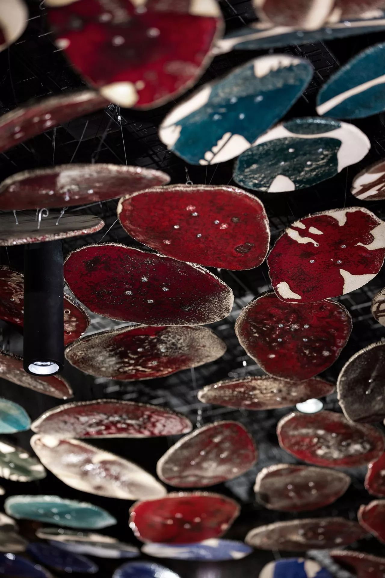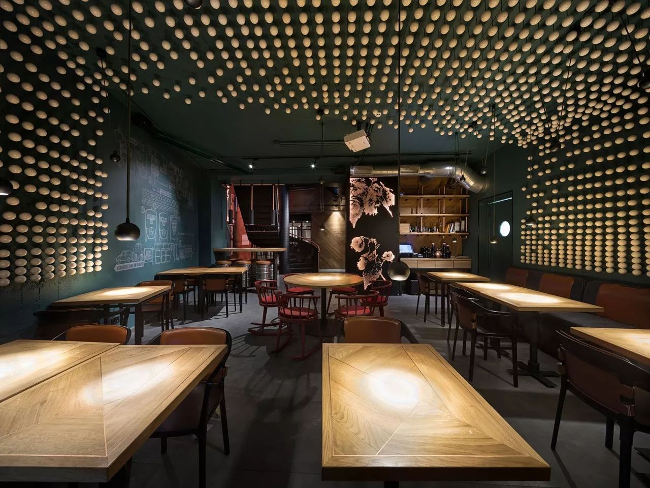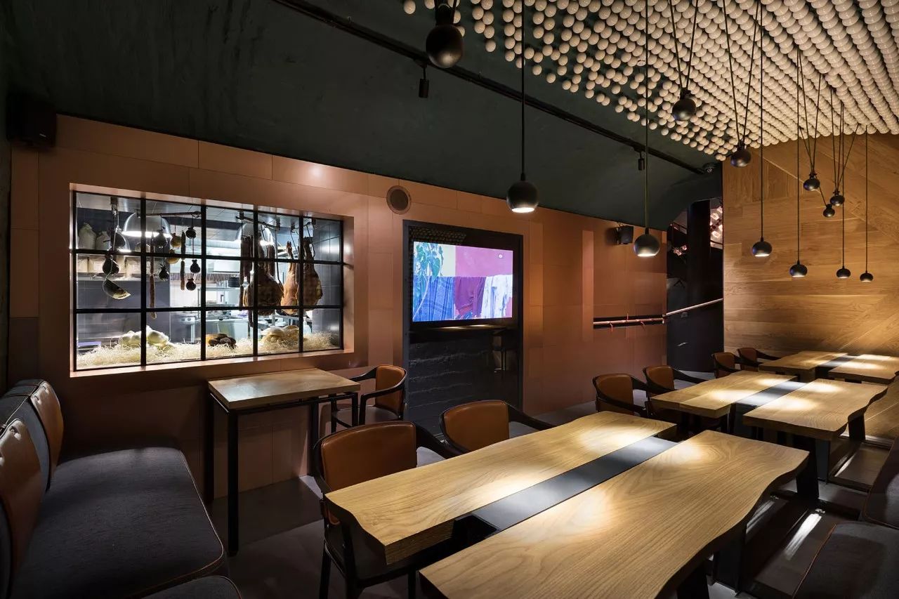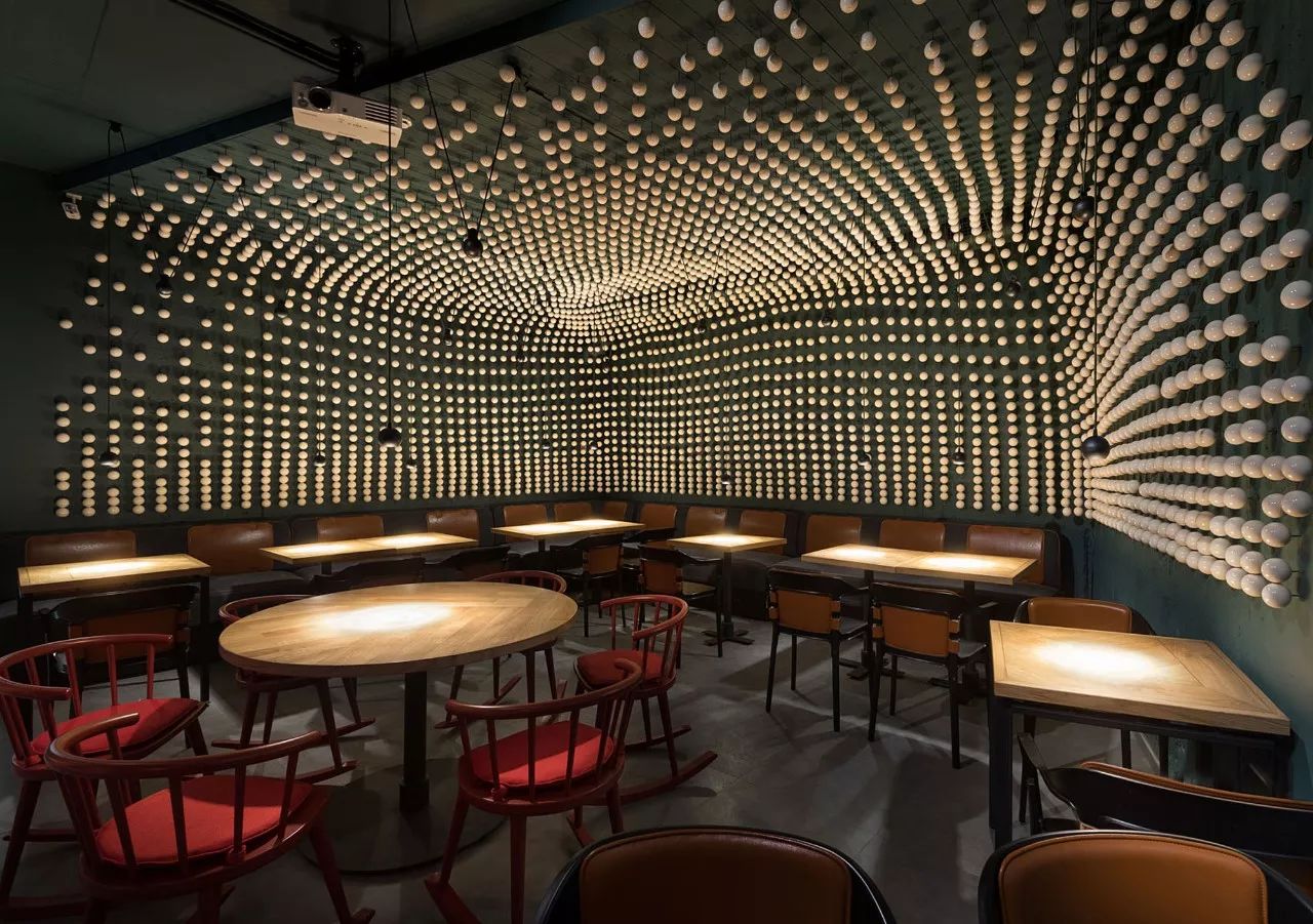 大厅中央是该机构的主要亮点之一 - 东欧最长的社区餐桌,可容纳约50位宾客。桌子由七个台面组成,由六个黄铜吉祥物连接而成,具有东方哲学的象征意义。桌子上方是空间的中央装饰元素 - 龙潜入水中的龙骨。该装置由1000个陶瓷秤组成,每个陶瓷秤都象征着鱼锦鲤。据中国传说,已经上升到黄河龙脑的鲤鱼变成了龙。在内部,这个门象征着大厅尽头的瀑布。