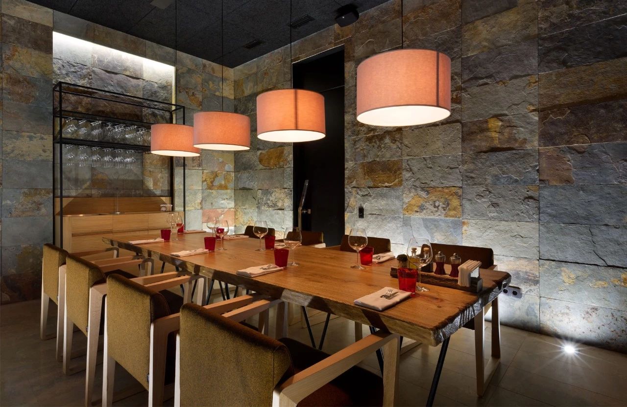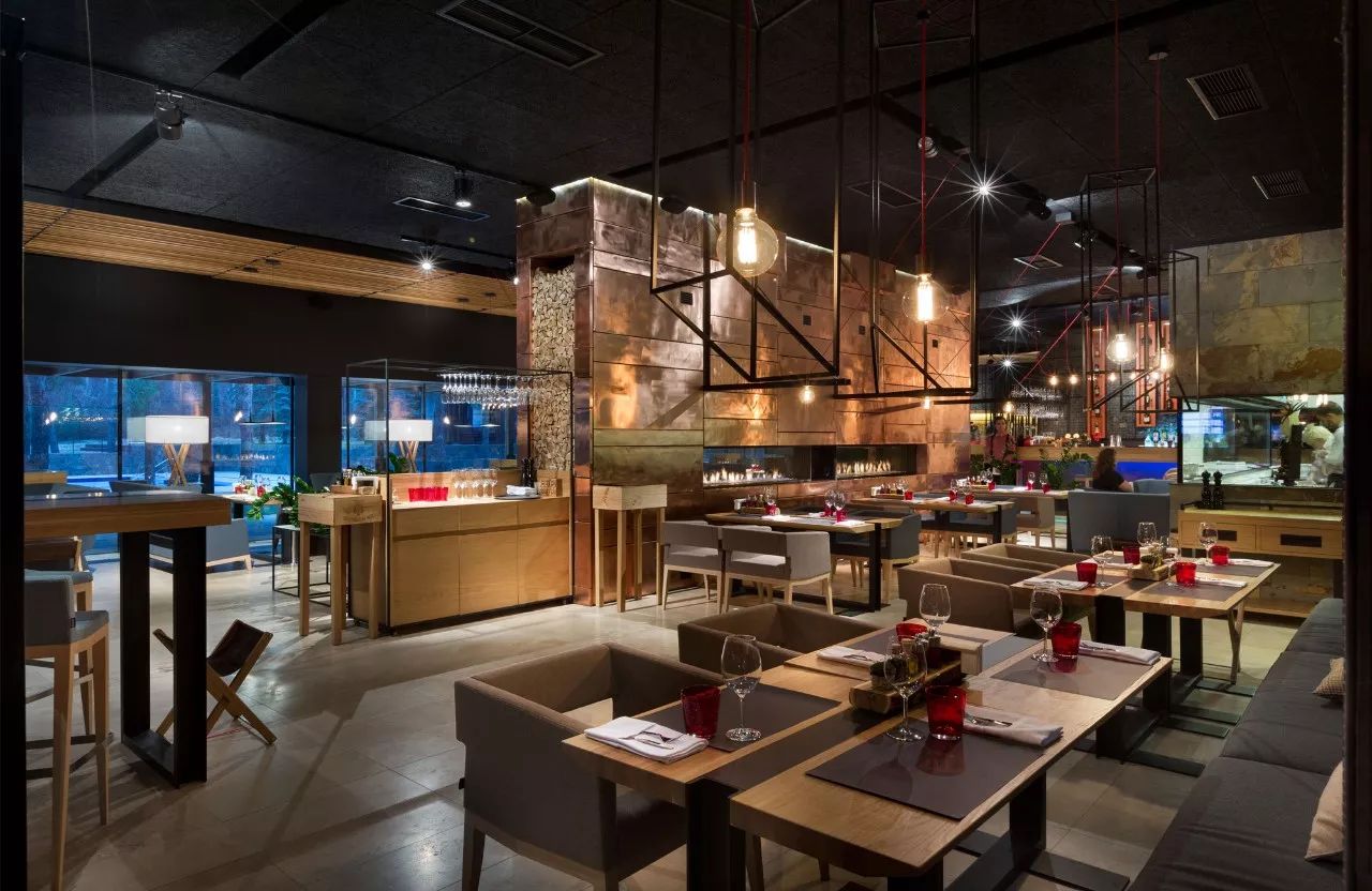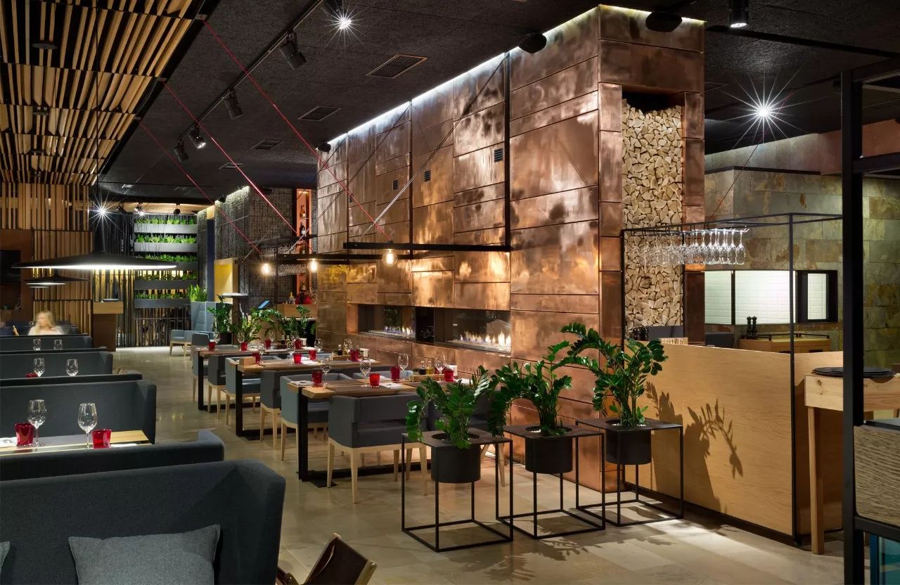 餐厅是Verholy酒店大楼的一部分。它不仅被酒店的客人访问,而且被邻近城市的居民访问。该建筑的概念确定了该综合体的位置:远离城市,位于松树林的中心。设计师的任务是创造一个娱乐场所,以满足当代城市居民的期望。此外,有必要将餐厅融入自然景观,充分利用优越的地理位置。使用天然材料(石材,木材,铜,科林斯,皮革,石板),我们设计出一个简约美观的现代化视觉清洁空间。为了将周围的自然融入室内,设计师在类似材料的帮助下使用了立面和内部结合的建筑招待会:石头辉长岩和金属可可烯。