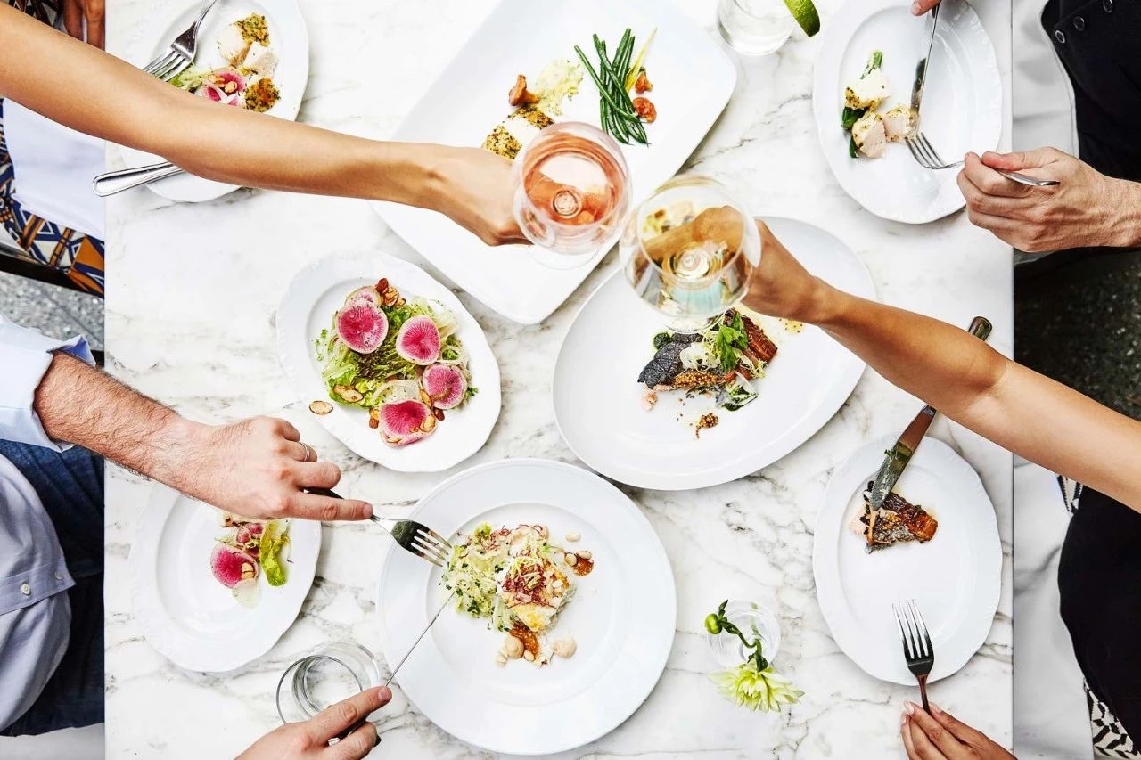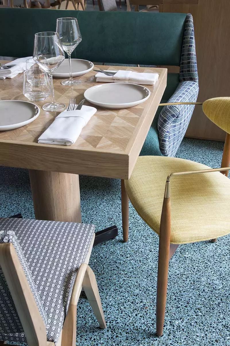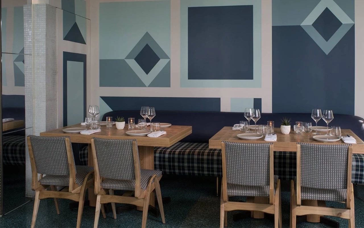 新设计包括新的座位区; 定制和复古家具的组合,例如20世纪50年代的Carlo de Carli沙发,以及美国中世纪设计师Dan Johnson的木制和黄铜餐椅; 并在主餐厅的尽头,设有一个大理石酒吧,周围环绕着复古铁锻酒吧椅,并重新镶嵌深蓝色和象牙色几何图案的皮革坐垫。The new design included new seating areas; a curated mix of custom and vintage furnishings, such as a 1950s Carlo de Carli settee alongside wood and brass dining chairs by American mid-century designer Dan Johnson; and on the far end of the main dining room, a marble bar surrounded by vintage iron-forged bar stools refashioned with deep blue and ivory geometric-patterned leather sling seat cushions.