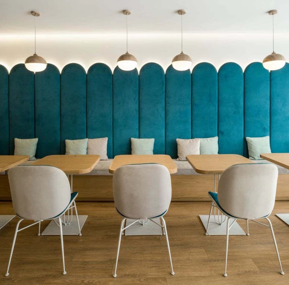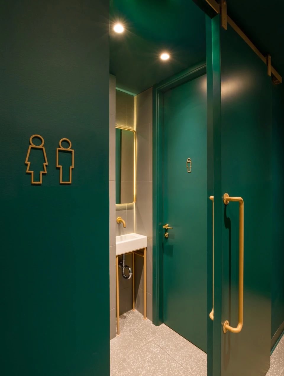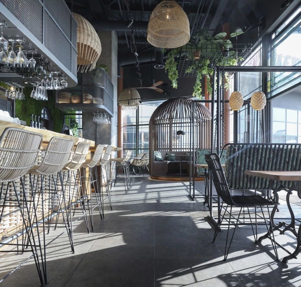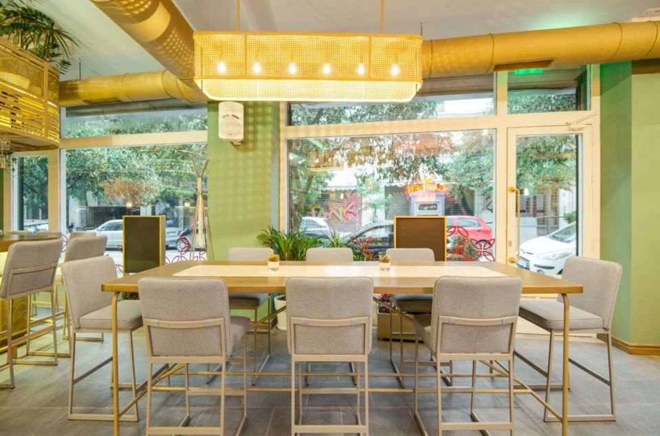 花园酒吧的想法源于在希腊城市发现的传统希腊共享庭院。空间的颜色是绿色的,墙壁上覆盖着真正的植物。地板铺上石头。