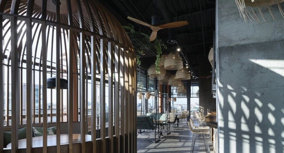 具体来说,这个空间被一个野蛮环境的元素打断,这个环境能够承受周围景观的粗糙。照明装置的编织网和用于酒吧柜台的未加工木质表面展现出异国情调的原始感。