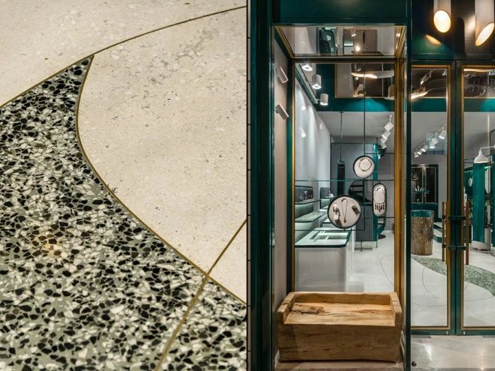 Urban Soul Project将雅典历史中心的珠宝店的天然材料与充满活力的绿色相结合。参考珠宝商的作品,Kakuru是一个有机的,无重力的空间,具有悬浮陈列柜,弯曲元素和内部玻璃幕墙,可在空间内创造视觉效果。
