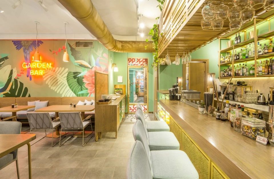 花园酒吧位于塞萨洛尼基的COLORS Urban Hotel酒店。该建筑在Tsimiski和Agiou Mina街道两侧开放,酒吧俯瞰着Agiou Mina街,犹太博物馆和一条酸橙树步行街。