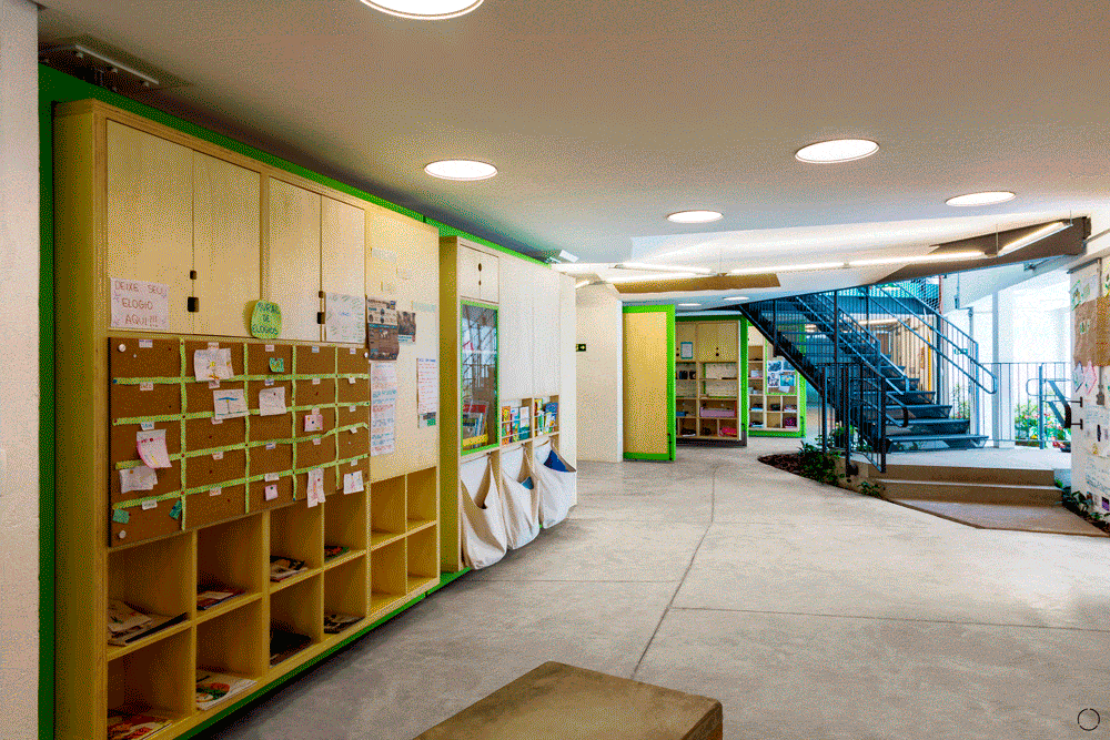 在该所学校的另一个单元中,Garoa 设计了一个更为激进的布局。通过将家具组装在可绕枢轴转动的金属框架中,产生了无限可能的空间组合。小的分隔房间,可以通过旋转框架墙体合并成一个大的综合空间,怎样组合变化将由学生们在当天会做些什么事情来决定,并且不同的空间组合也对学生们的行为产生影响。据该公司称,“因此,从一个点走到另一个点,可以选择不同的路径,产生不同的交互,选择创造任何你需要的空间形式。”
