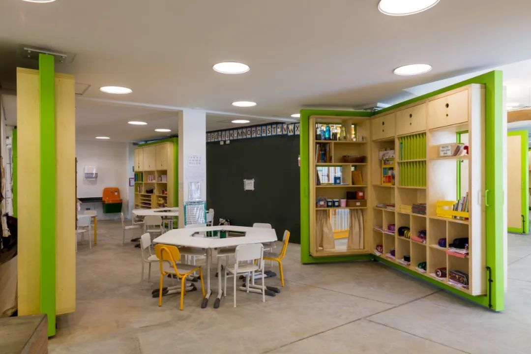 圣保罗建筑师 Isay Weinfeld 在 Livraria da Vila 书店项目中设计了一个似乎由下方薄书架支撑的巨大体块,这四个书架可以旋转并向街道打开。在 Garoa 设计的 Wish21 学校中,现有建筑的开放空间容纳了可移动展板和折叠式家具,为多样化的教育活动提供了最大的空间灵活性。用建筑师的话来说:“我们将平面图视为一个由收缩和扩张区域组成的领域,虽然存在着边界限制,但它们是脆弱的,我们认为孩子们才是活跃的行为主体,允许和鼓励他们跨越这种界限,鼓励富有想象力地去挪用各种空间要素。”