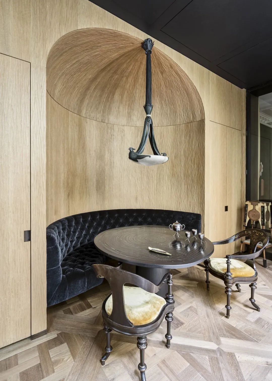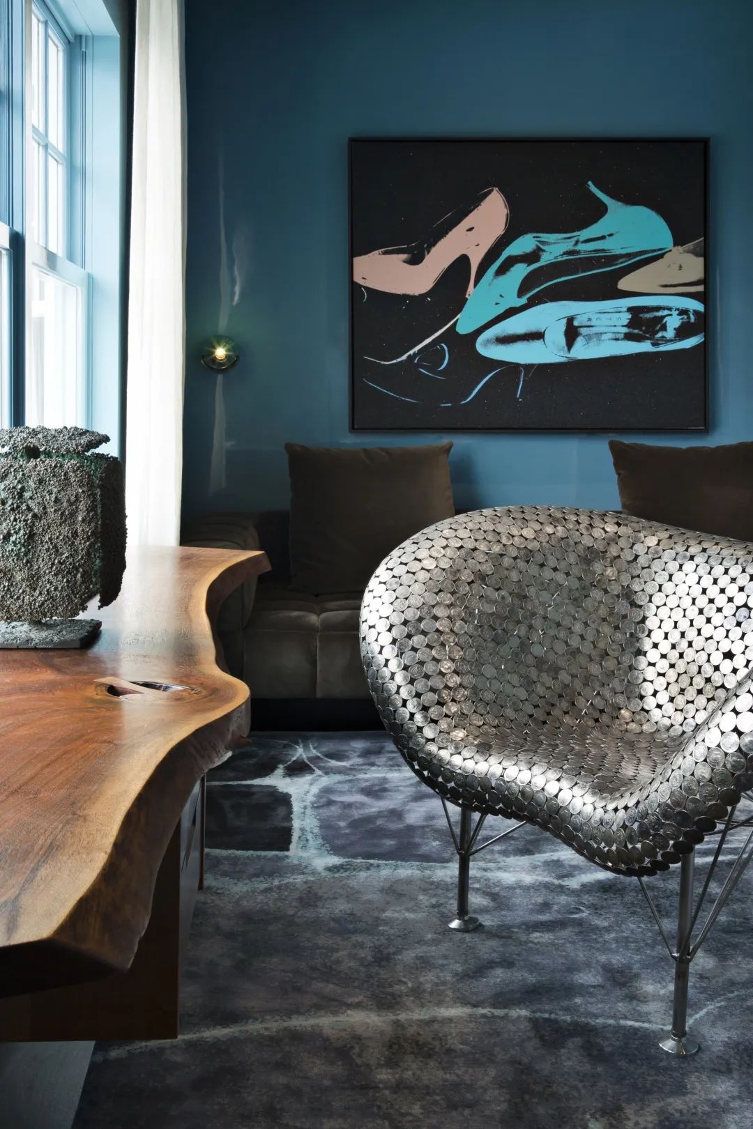 别具一格 的壁灯,可圈可点的艺术画,对色彩有着敏锐的捕捉能力,黄铜,丝绒,皮革,镀铬,水晶等材质赋予空间华贵,精致的调性氛围。
