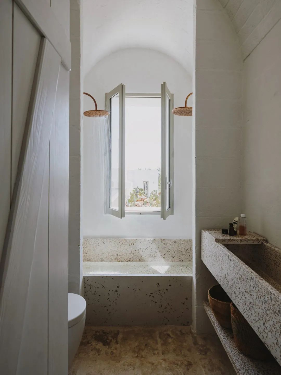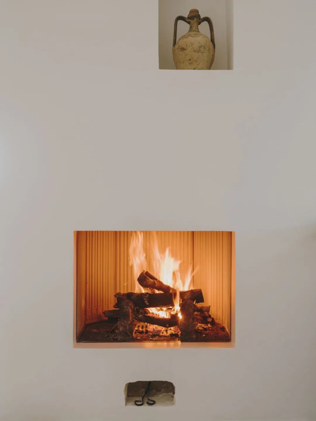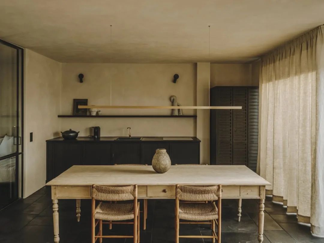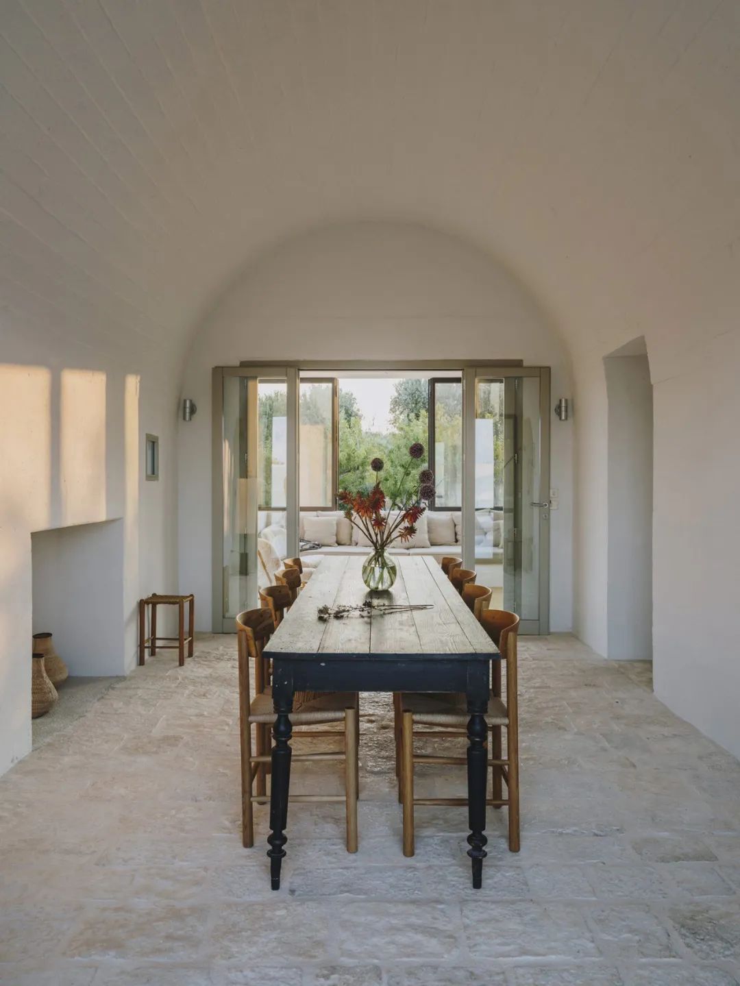 白石墙与拱形天花板打造了一个充满故事感的通道,伴随着粗糙石材铺就的地板渐渐走向用餐的长桌,由于尽头的窗户打开,室外的景色与光线得以通通涌入,落日余晖映照于墙,让人沉静在这样的氛围感之中。