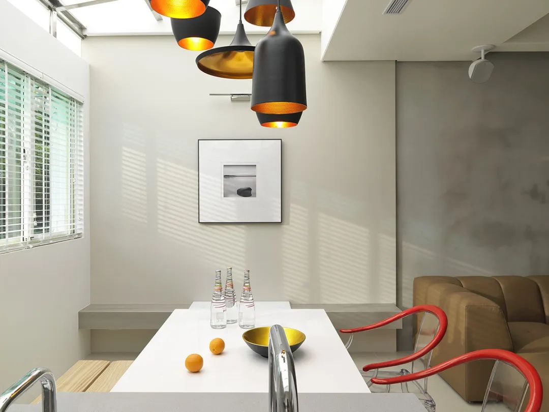 金银黑三个造型灯饰,描摹出后现代主义画作意象