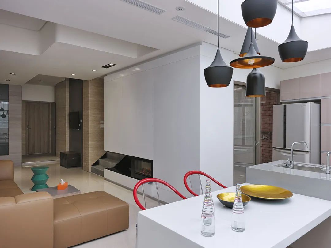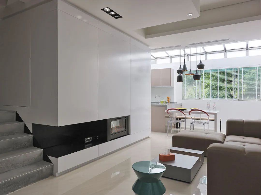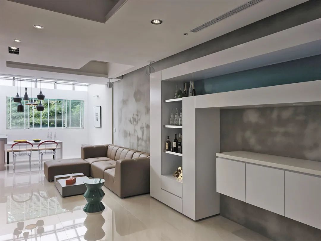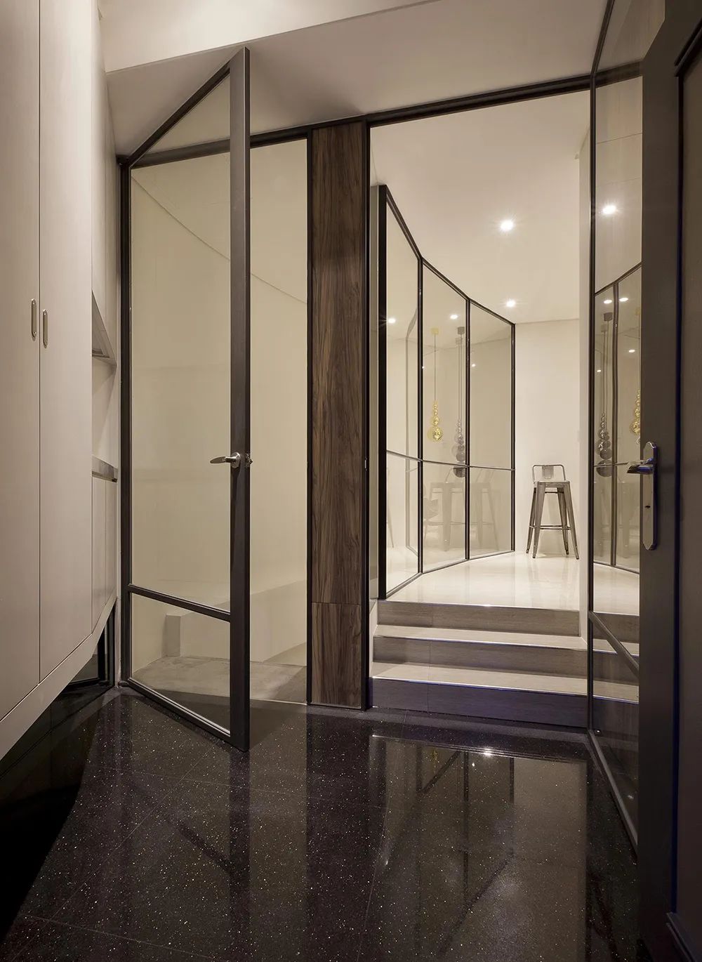与雪白泛光钢烤漆对照,是极简清雅的水泥墙
