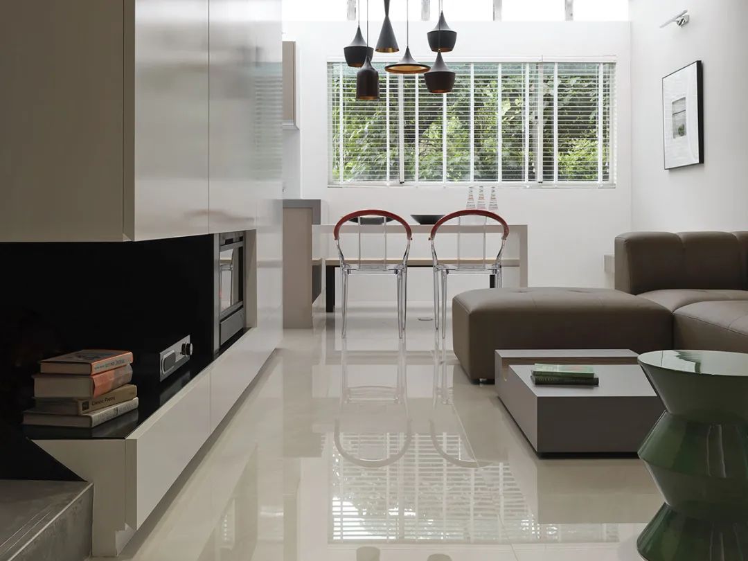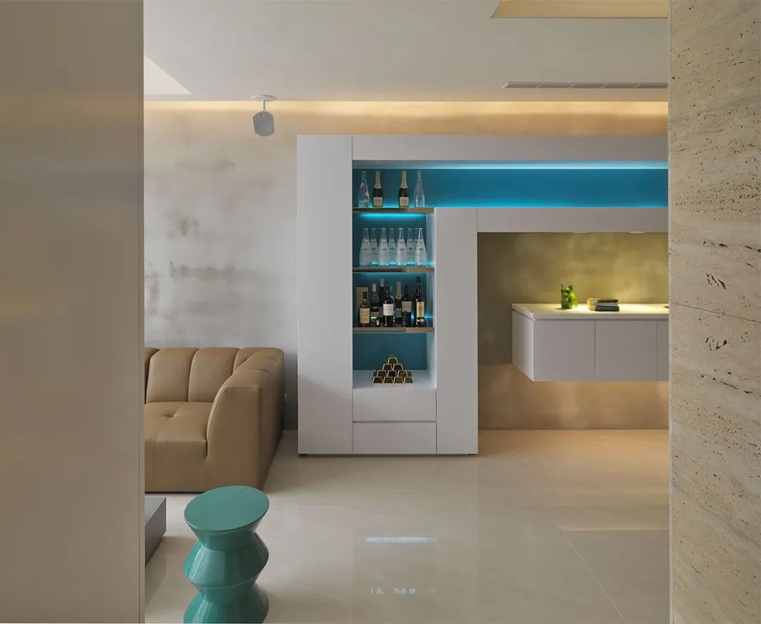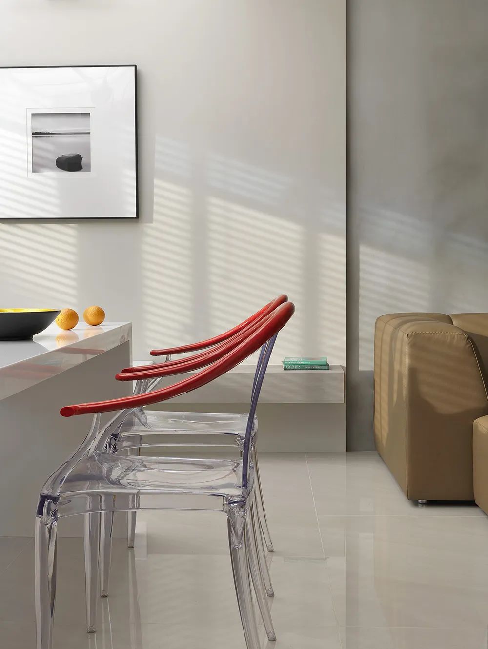 与雪白泛光钢烤漆对照,是极简清雅的水泥墙