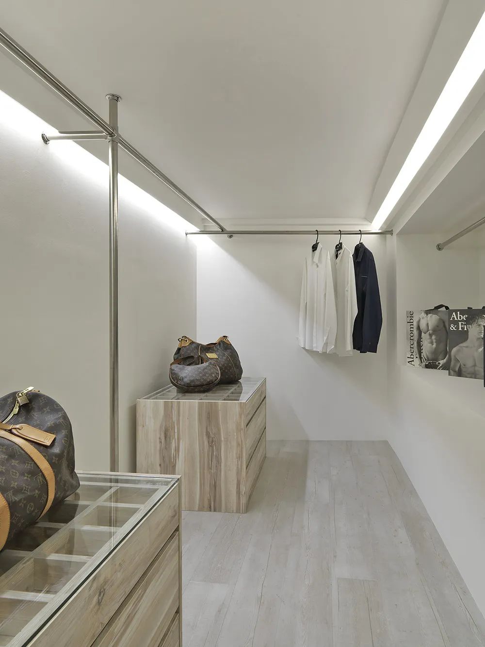 却巧妙化身为宽敞更衣室,利用横杆吊挂衣物,井然有序