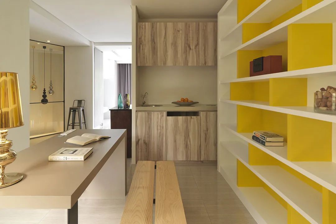 沿墙面辅以一字型桌与备品柜,匠心独妙的安排下