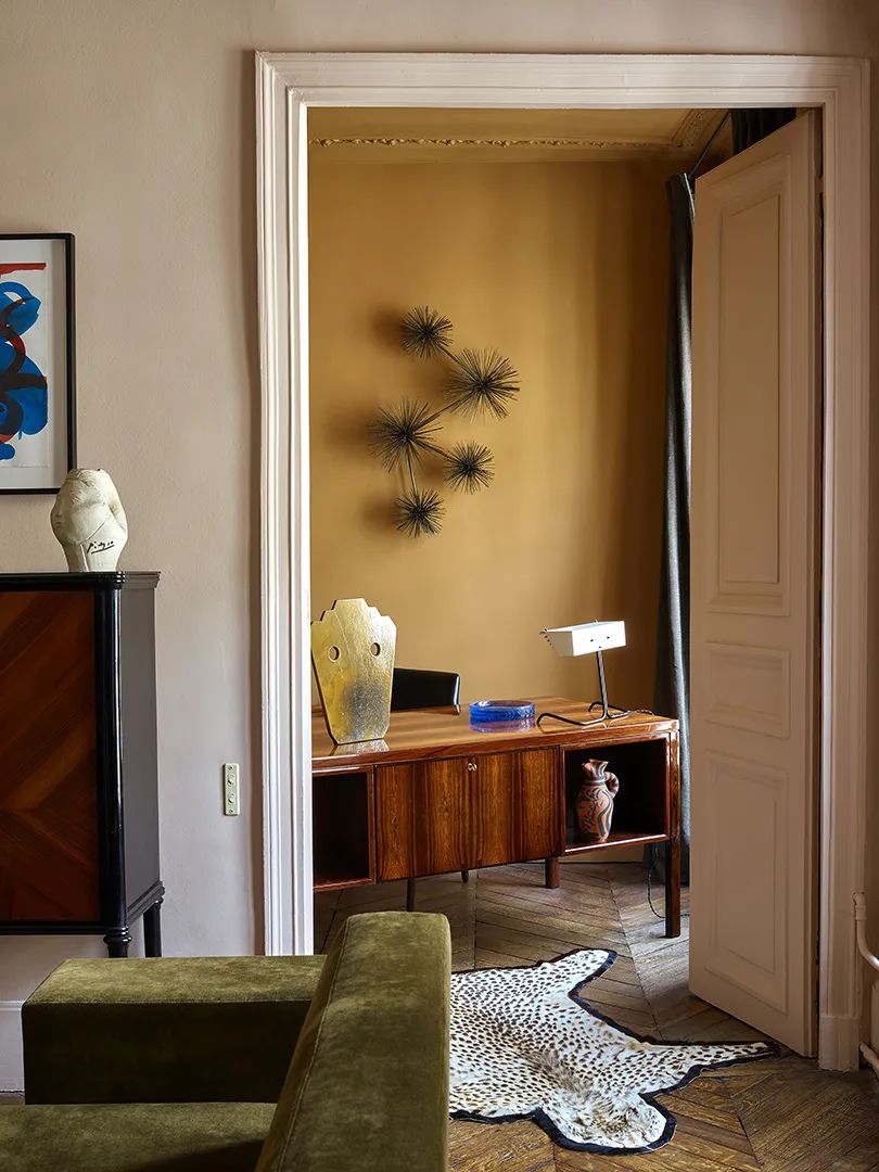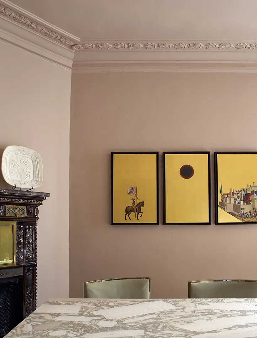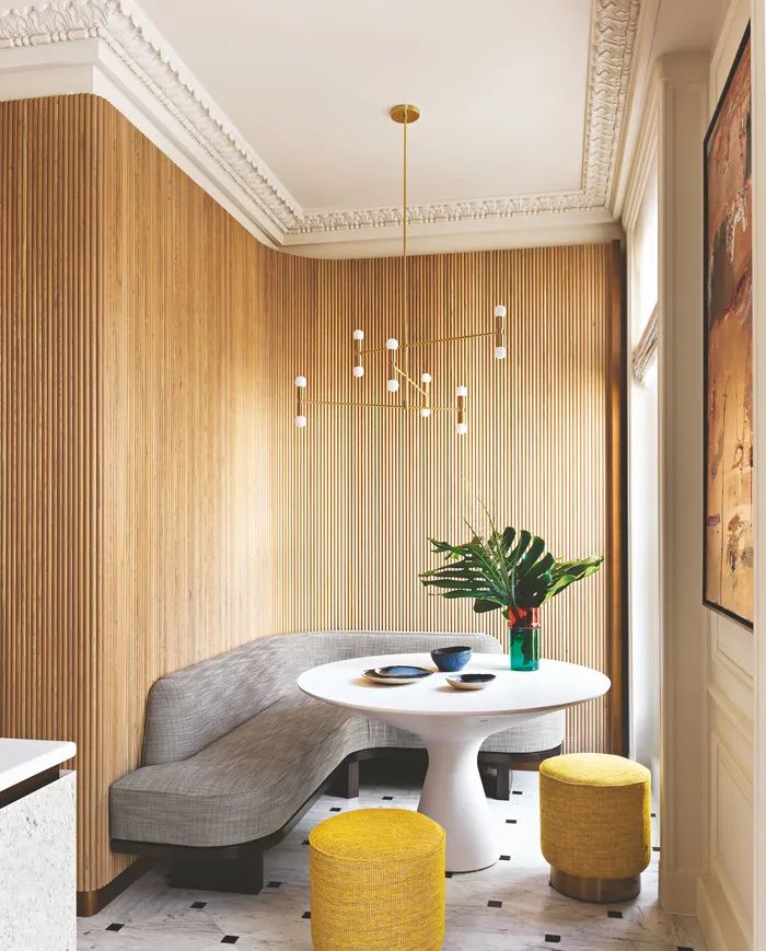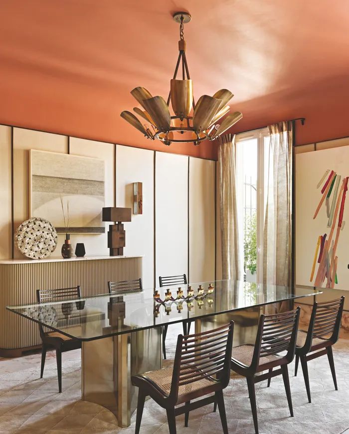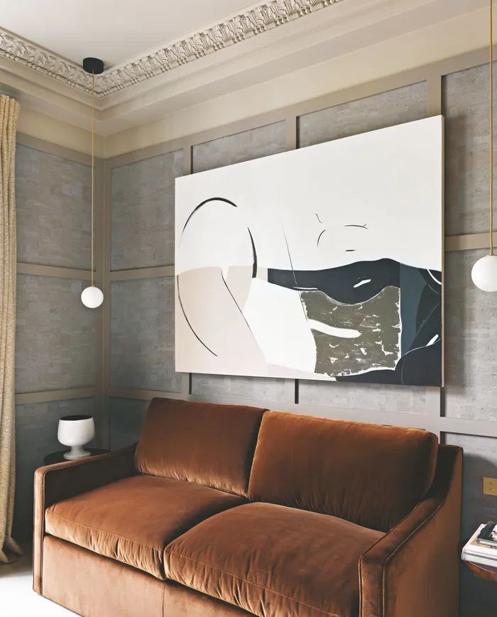 由于大量的窗户,家中每个房间的光线全天都在变化。Parente 让这项研究画了一种深芥末色,根据时间的不同,它看起来“不是黄色、不是棕色、不是橡木”。在客厅里,柔软的灰白色墙壁可以从黎明时的红晕发展到傍晚时分的粉灰色。“我喜欢这种模棱两可的感觉,”Parente 说。“你真的能感觉到阴影。”
