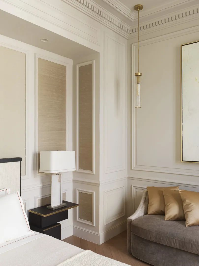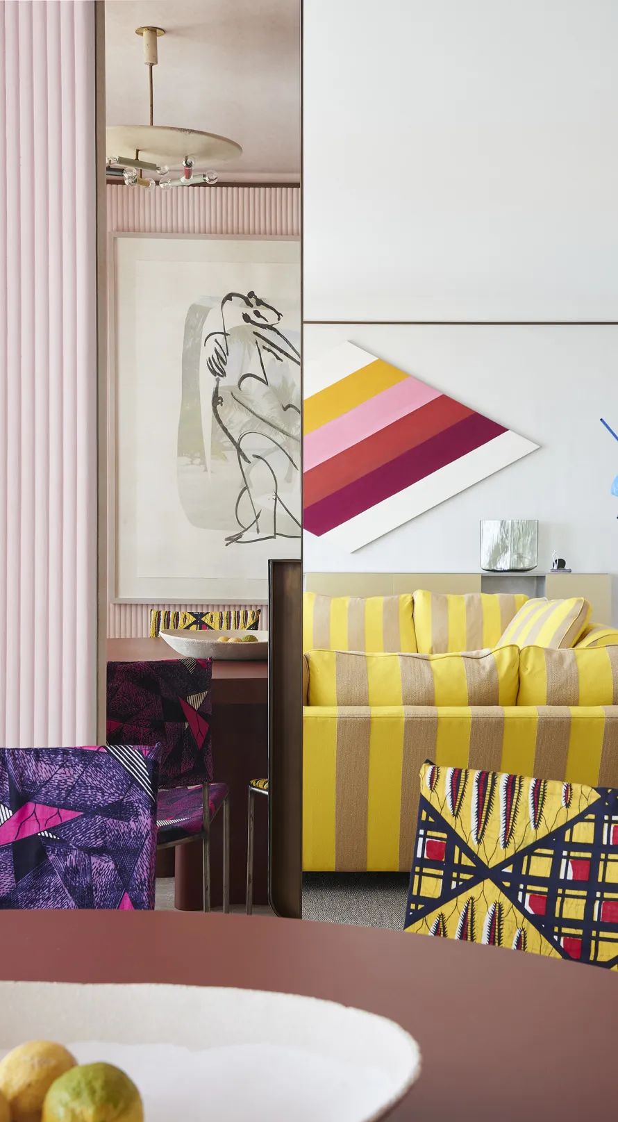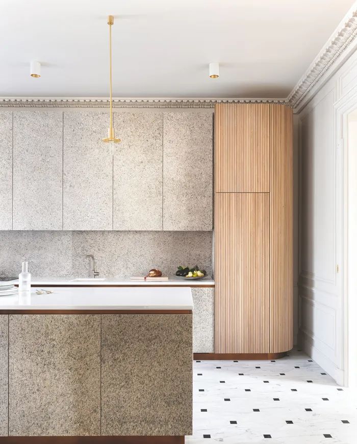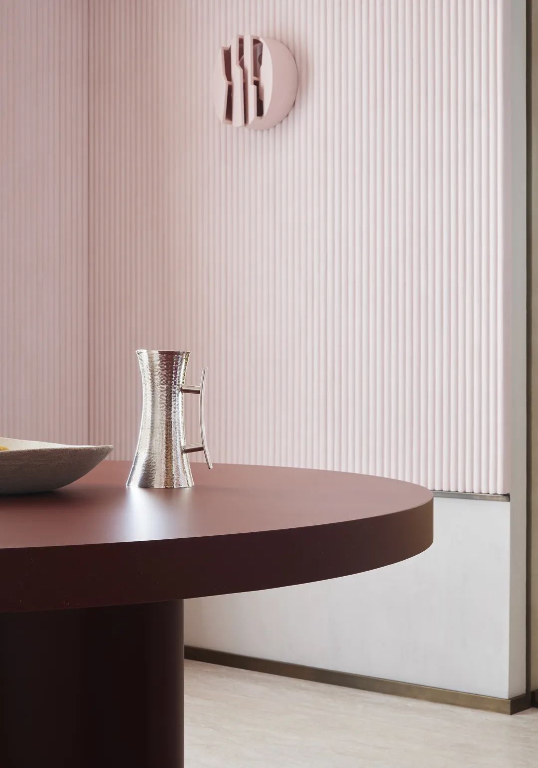 由于大量的窗户,家中每个房间的光线全天都在变化。Parente 让这项研究画了一种深芥末色,根据时间的不同,它看起来“不是黄色、不是棕色、不是橡木”。在客厅里,柔软的灰白色墙壁可以从黎明时的红晕发展到傍晚时分的粉灰色。“我喜欢这种模棱两可的感觉,”Parente 说。“你真的能感觉到阴影。”