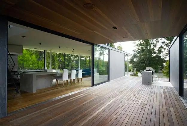 两个垂直的体积从地面伸向河流,一个带有卧室和浴室的私人区,另一个带宽敞的居住空间。两者之间每侧都有大型玻璃滑动门通往一个露天甲板,可向河水推进,并可以欣赏到丰富的景观。