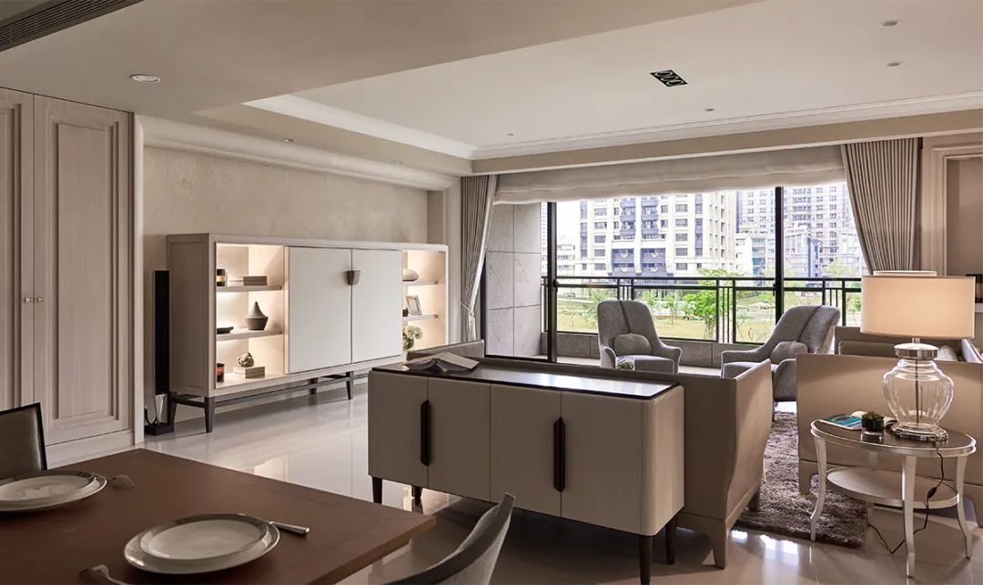 将客厅的柔和氛围引为主调,并配置现代线条的家具饰品