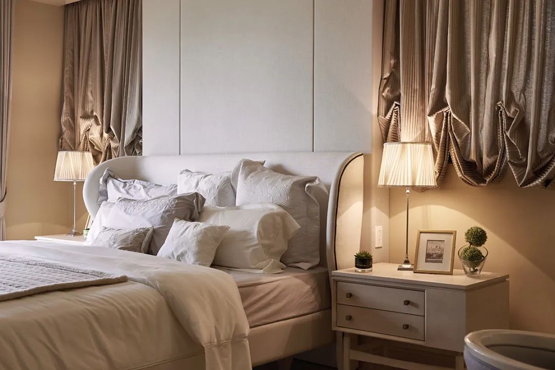 卧房延续公领域的古典风格,床头以窗帘装饰
