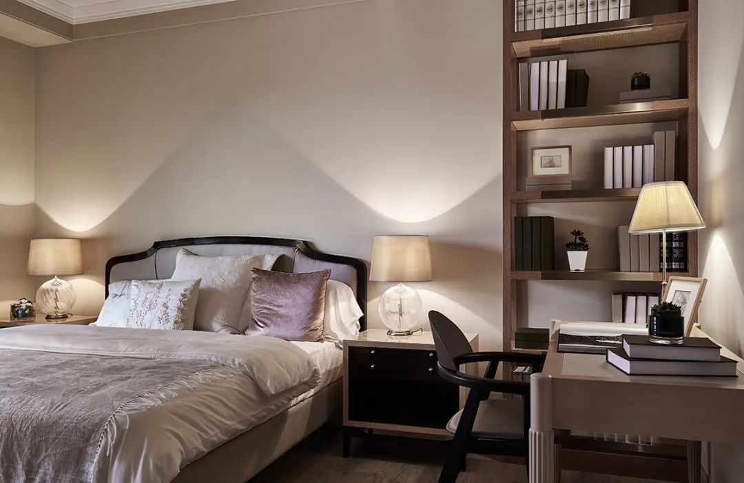 长辈房以大地基调为主,床头与柜体运用深色元素