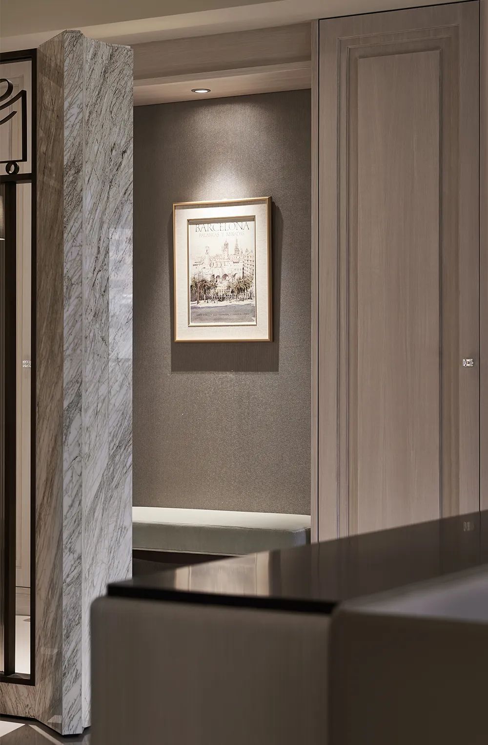 以大理石材壁面、白色木质线板、浅色绷布共塑的雅致情调