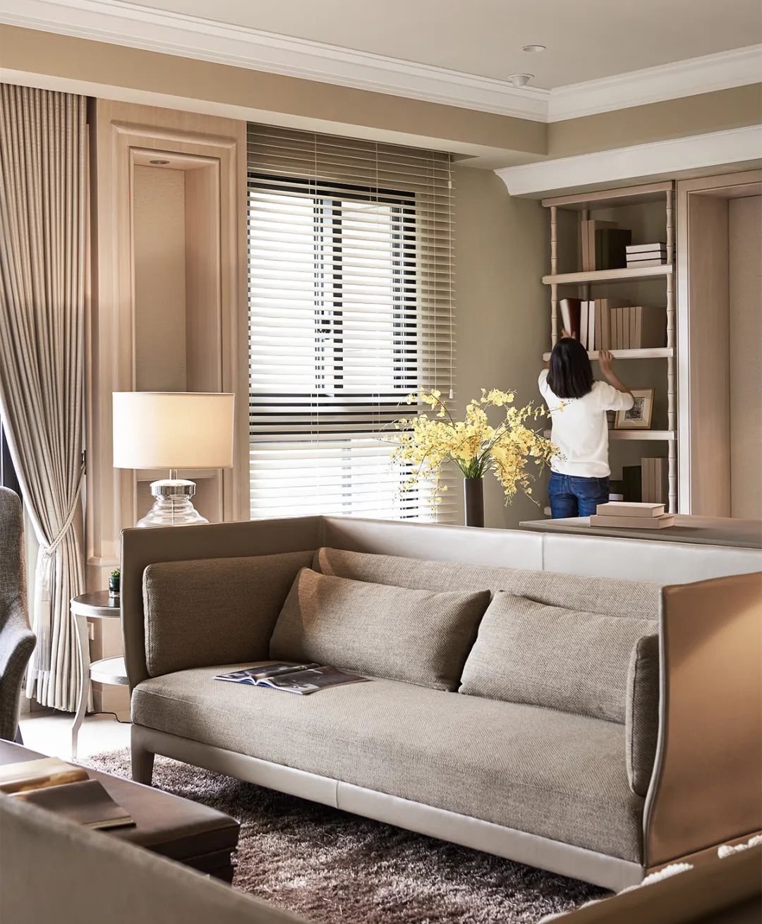 让布面在高低差之间流动着轻盈,并与简约净雅装饰板相衬