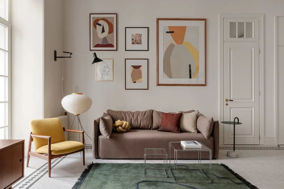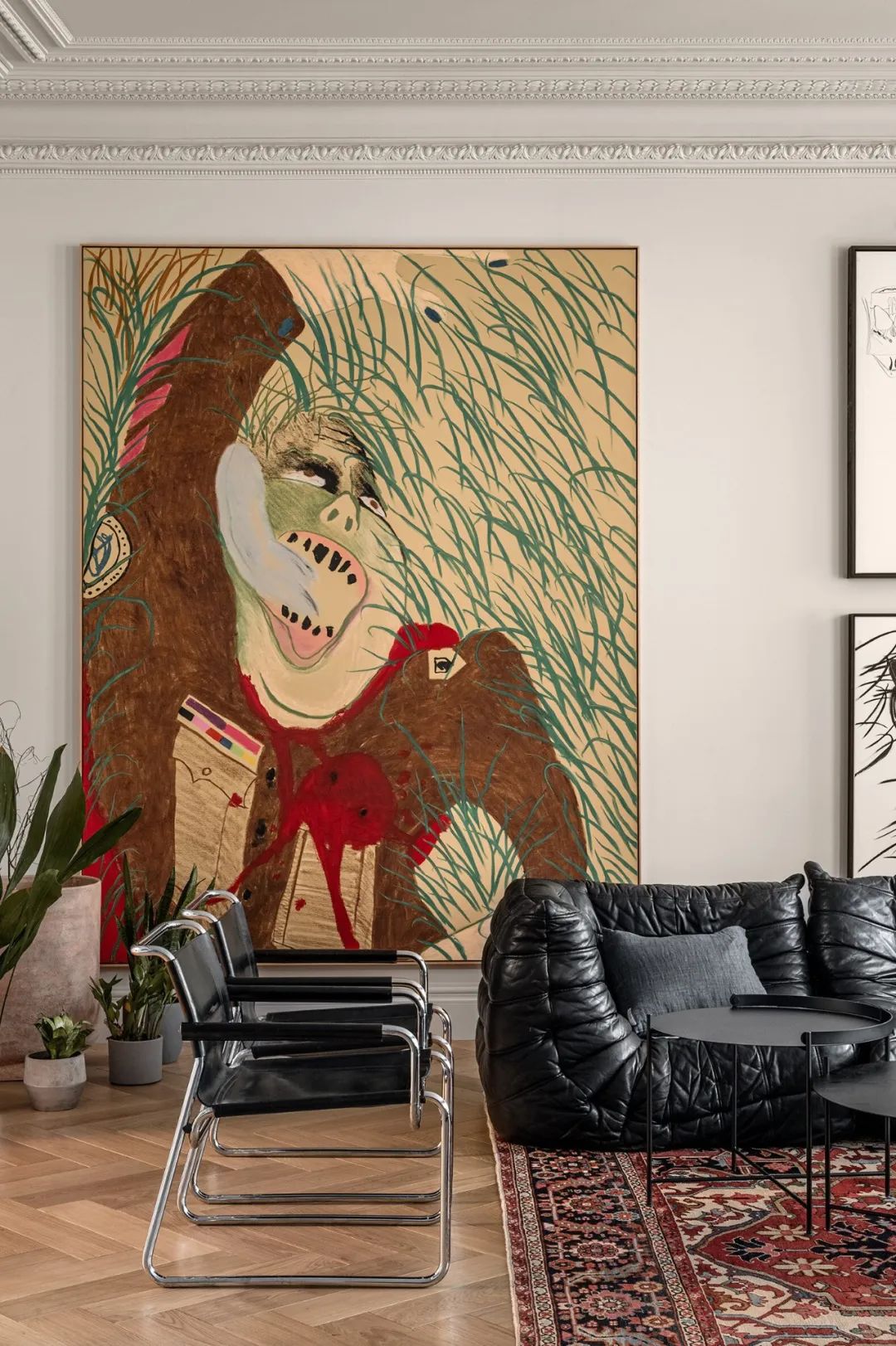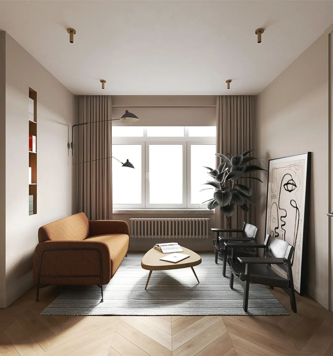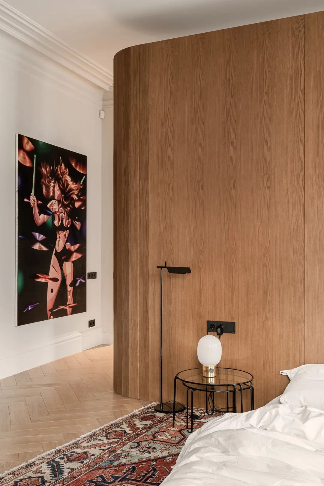 这座公寓面积为65㎡,天花板约4m高,所以在视觉上这所公寓现代开阔。Yevheniia Dubrovska利用天花板的高度打造了相当高的门框,以使得自然光线可以照亮整个空间。客厅里运用了莫兰迪的撞色,低饱和度的沙发、地毯、单人椅虽然色彩不同,却在气氛上达到了一致。错落展示的装饰画弥补了层高带来的空白,让整个空间更为满足、舒适。