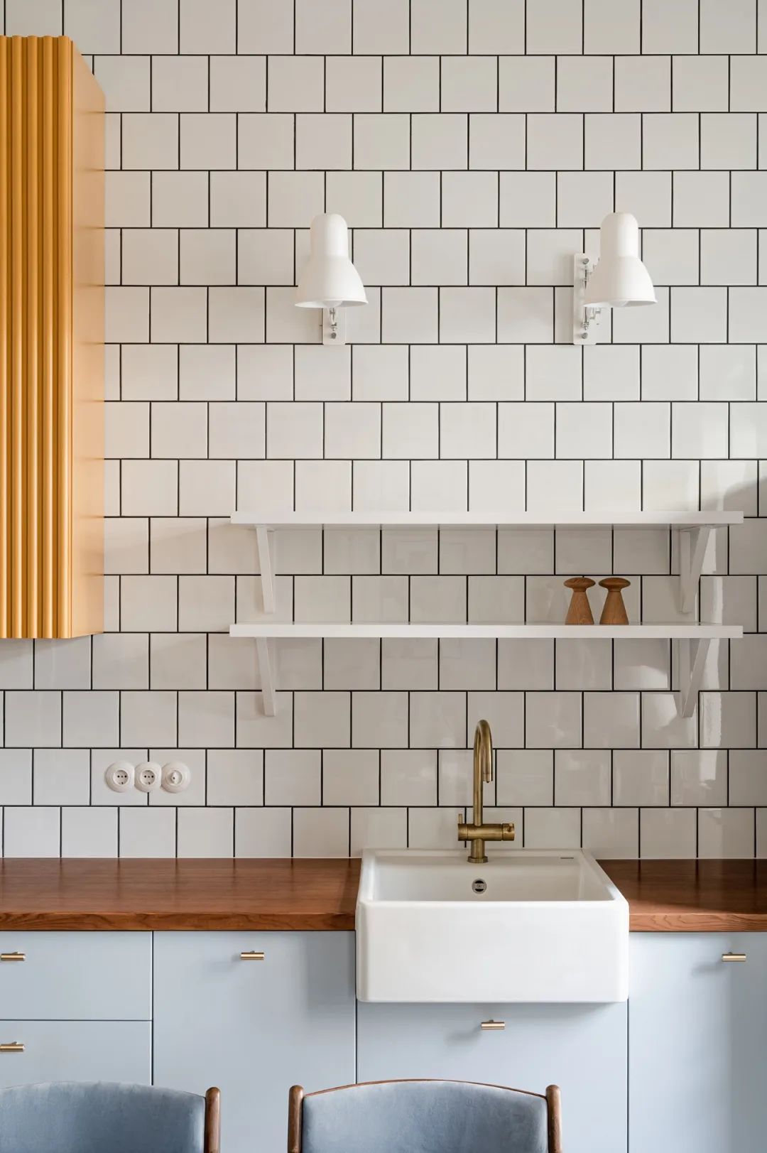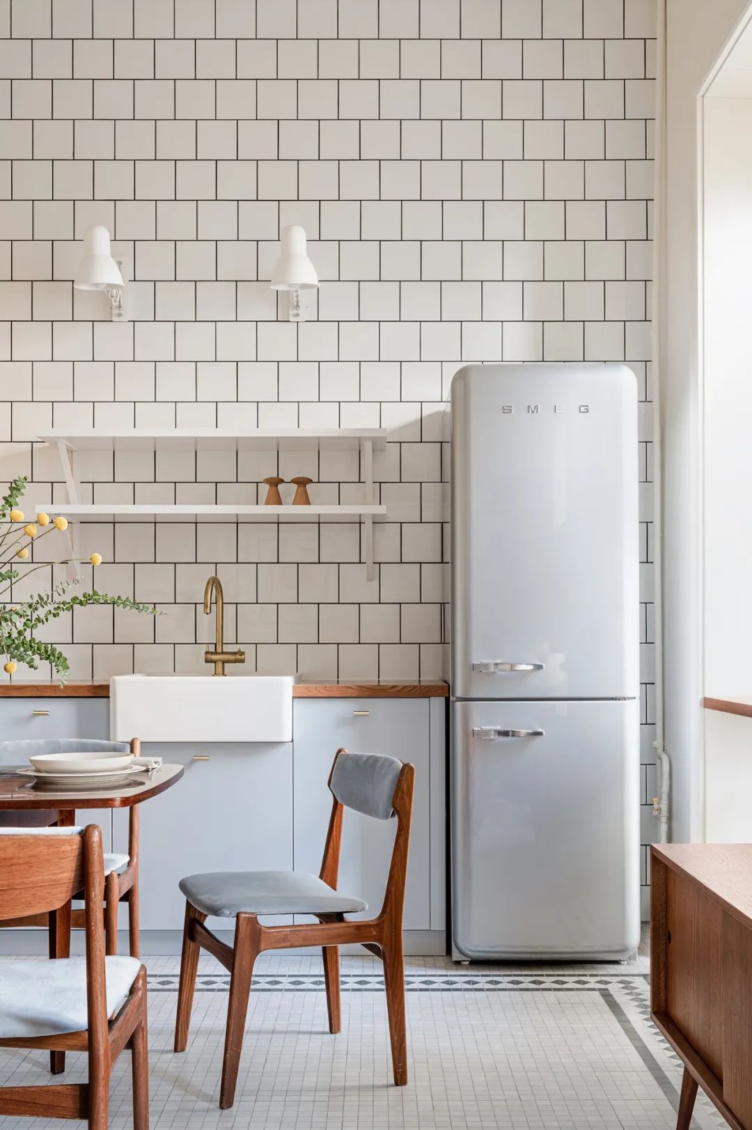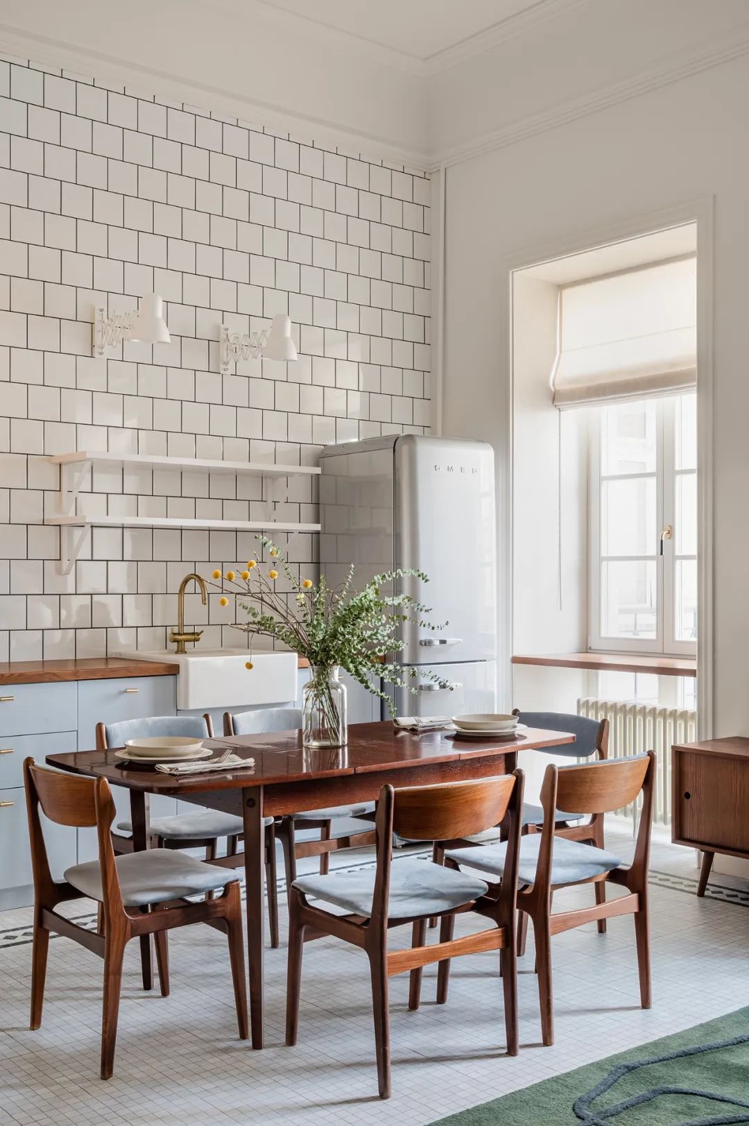 厨房和餐厅都是开放式的,厨台倚靠的背景墙被全部贴满了复古的小方格瓷砖,与柚木的颜色形成一种复古的趋势。