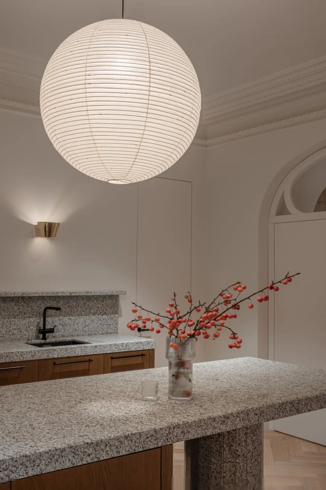 厨房的简约清新主要通过白色的底色和水磨石的融合来进行叙述。在线条上,厨房通过曲线来表现温柔的生活态度,例如垂直于餐桌的现代白色灯笼。干净、静谧,折衷的设计风格将厨房塑造成了一个安静的过渡领域。遵循自然简约的设计规则,设计师用朴素的布局和天然的材料勾勒这里的平淡天真。