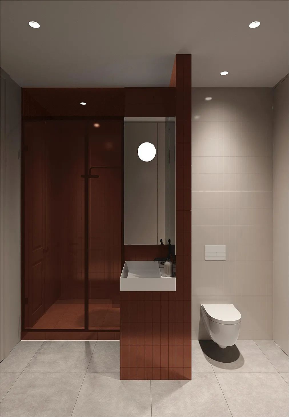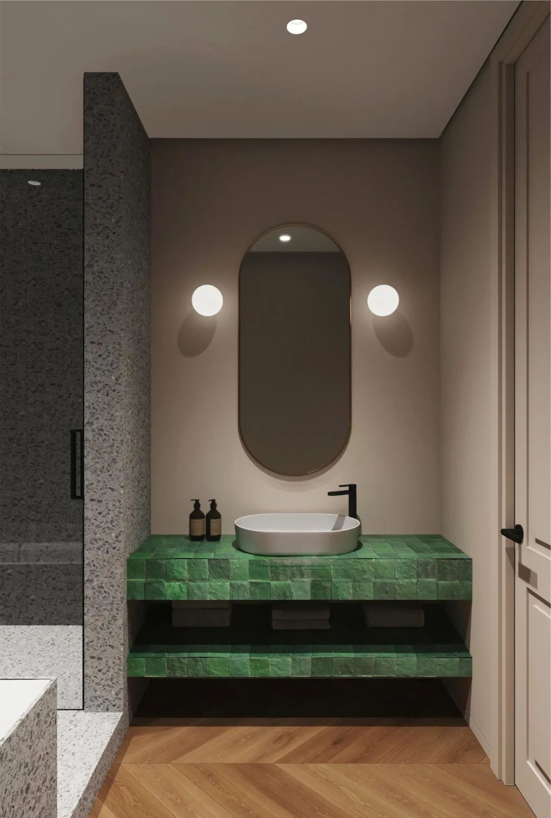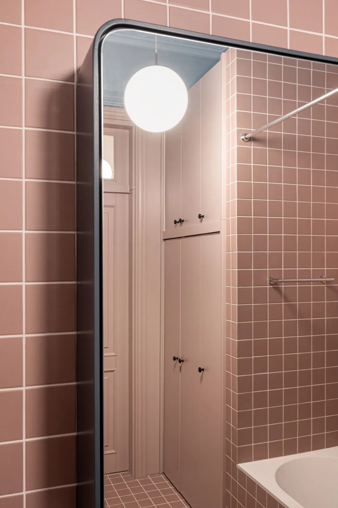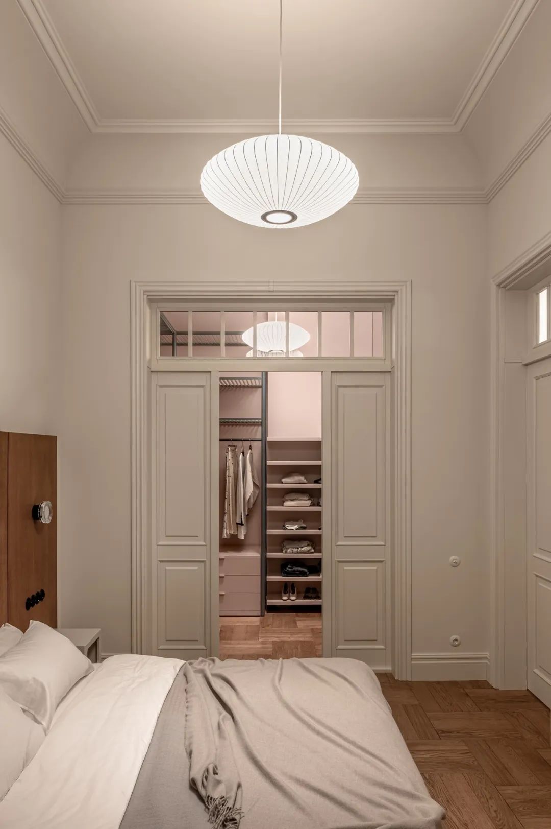 一个独立的衣帽间是业主特别要求的,这间衣帽间与卧室由一面双开门连接起来,墙面被刷成了淡紫色,与低饱和度的翠绿色营造出一种柔和浪漫的感觉,柔和的灯光更为其添上一层天然的滤镜。这种感觉也是整座公寓的风格缩影,精致又大方的细节和柔和低调的色调共同组合成了这所简约的浪漫公寓。