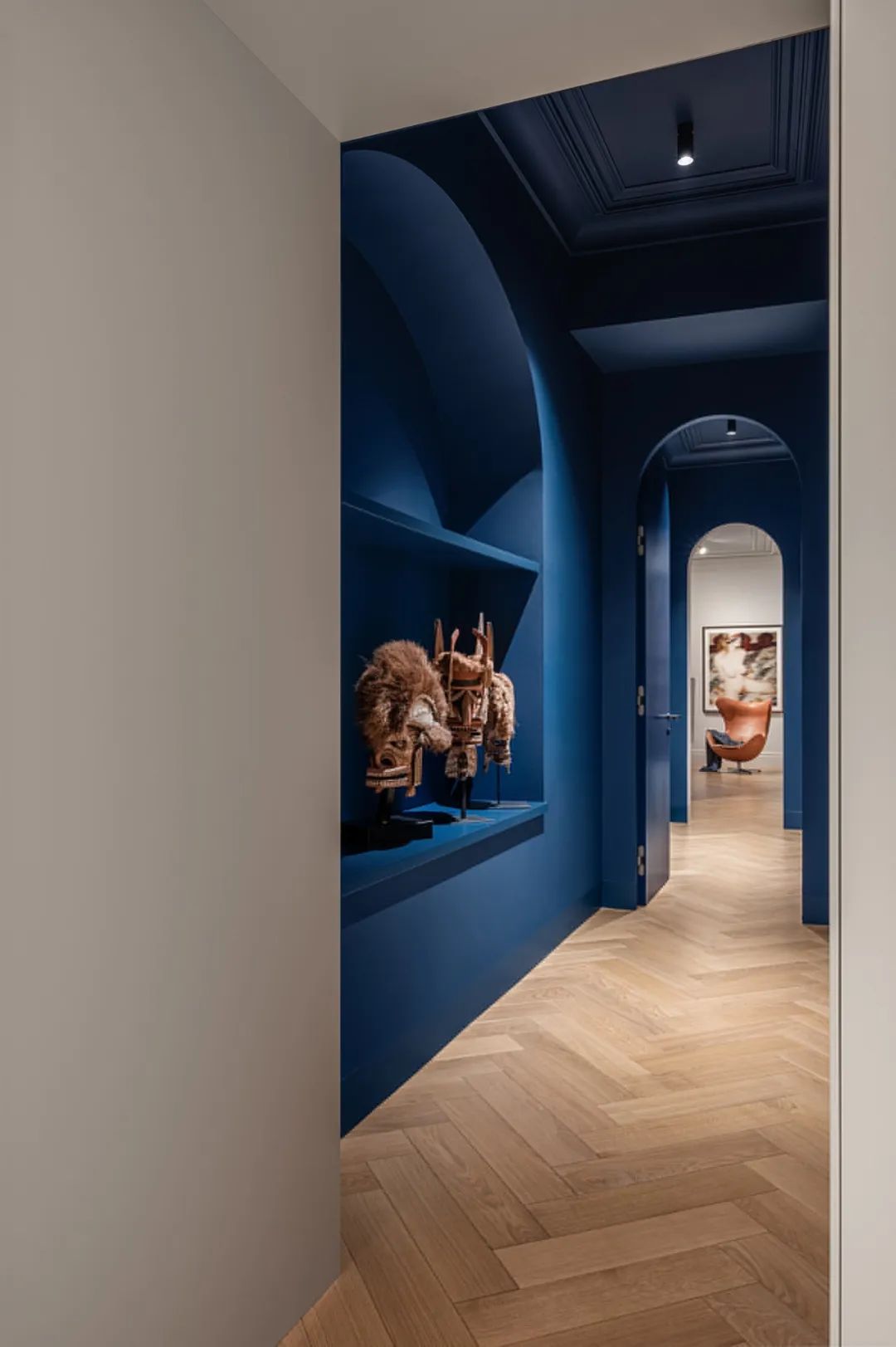 连接卧室与配套浴室的走廊被刷上了醒目的蓝色,这抹蓝或是为了与室内的艺术品形成一种质朴的呼应。沿着蓝色走廊走到浴室,这里被大理石的拉丝纹理填满,黑色的五金更显中性的高级感。