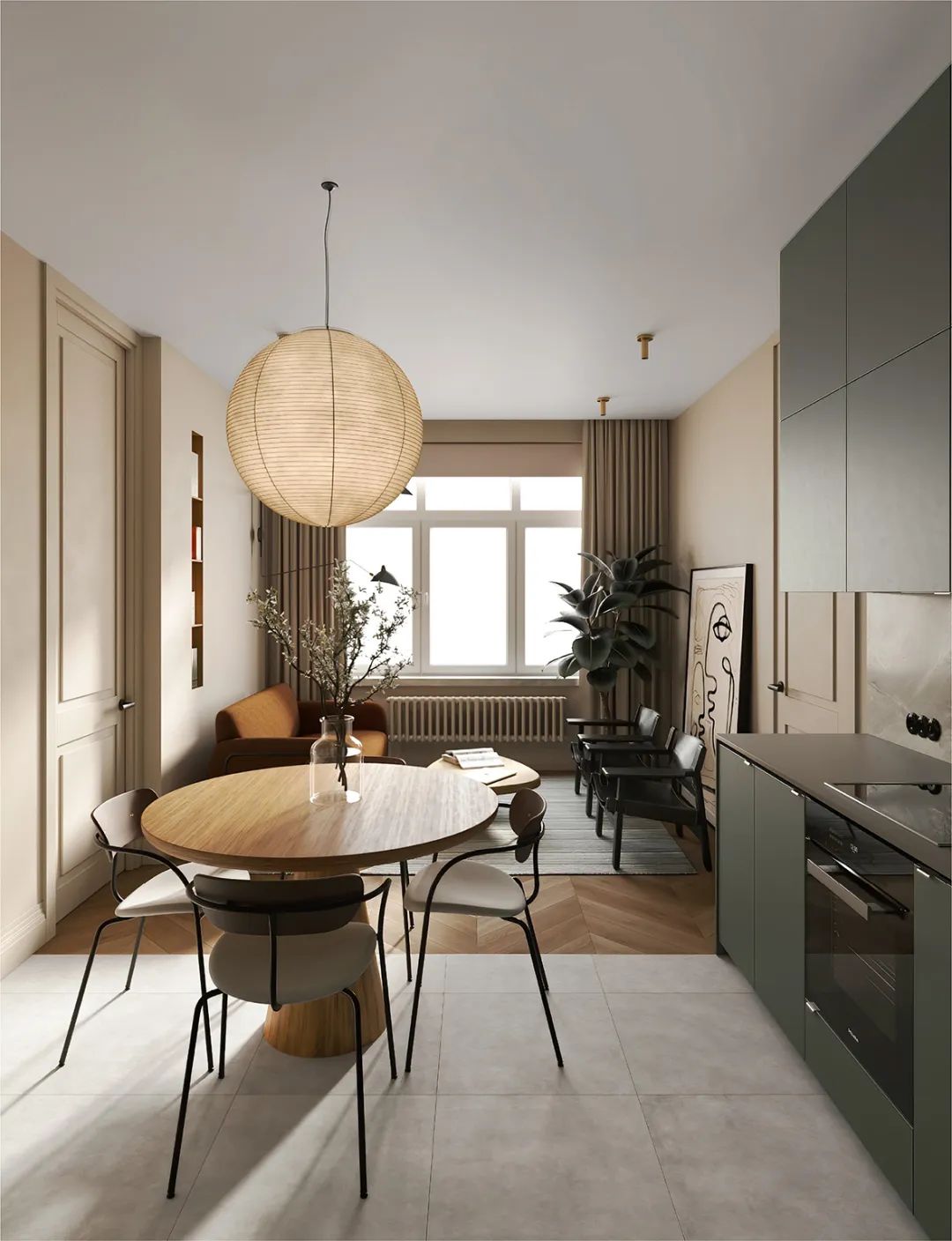 这个空间的亮点是Yevheniia Dubrovska对色彩的把控,好像她有着一支三维吸色笔,可以从自然中吸取颜色再将其应用到家具上,比如厨房的厨柜与客厅的绿植盆栽的颜色几乎相同。