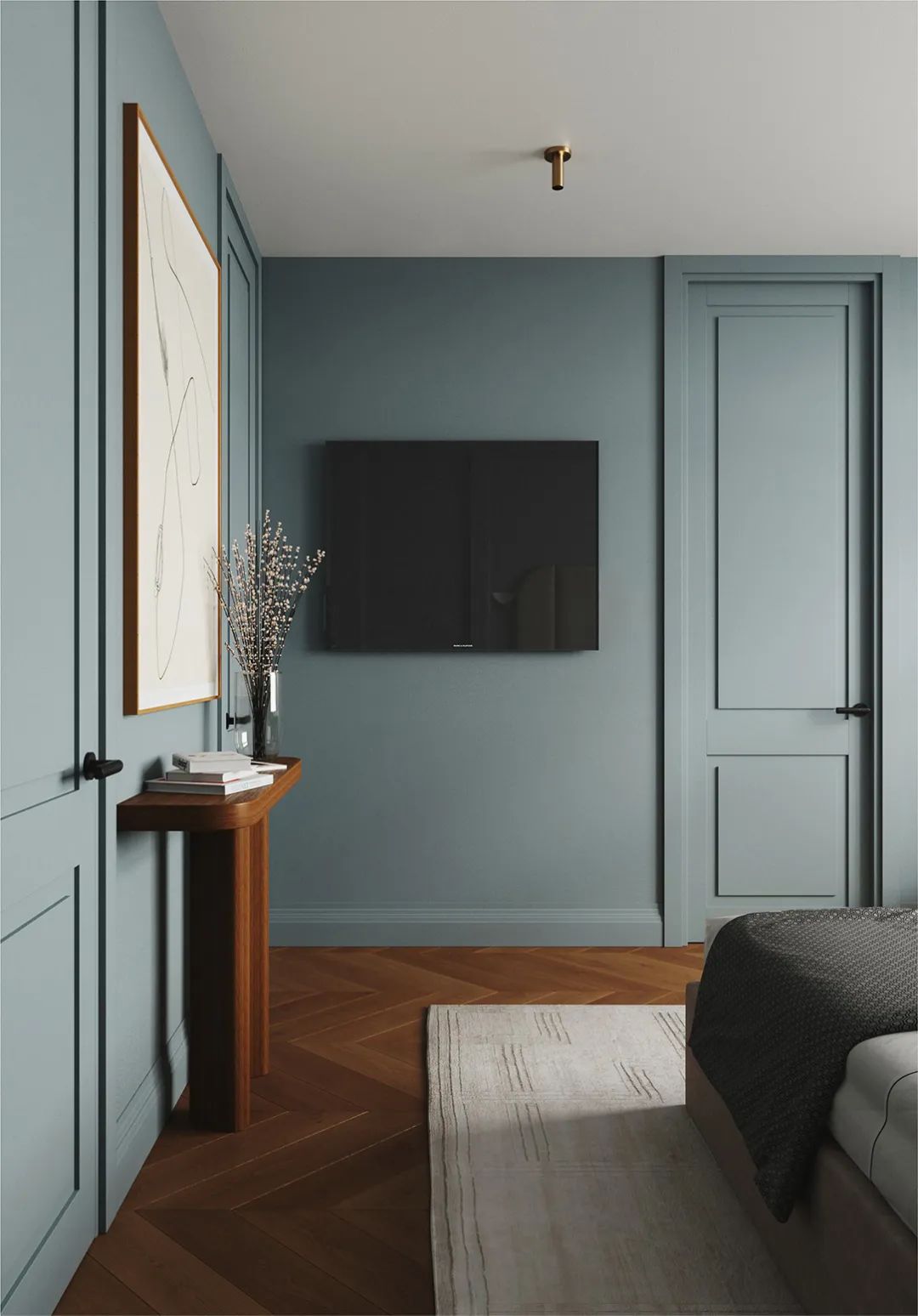 室内设计选择的色彩与业主的生活态度之间一定有着某种联系,低饱和度的蓝绿、浅褐色,一冷一暖,填充了这个私密的空间。这柔和的色调和独具匠心的陈设比例恰到好处,使空间焕发出动人的生活旋律。