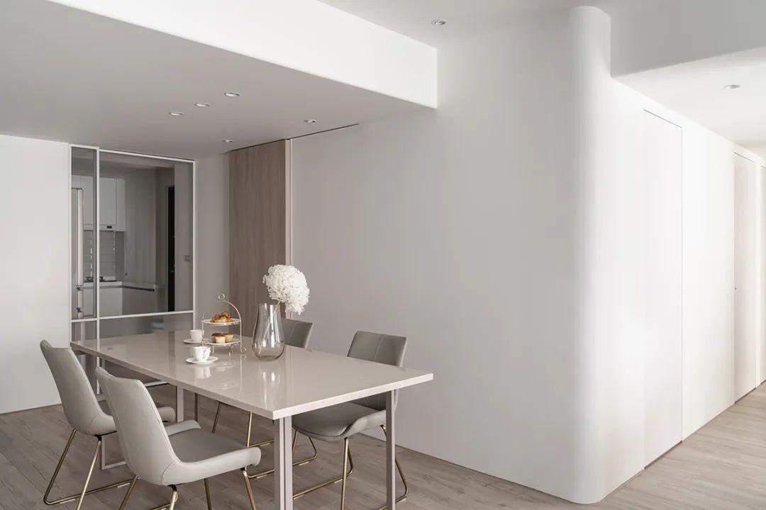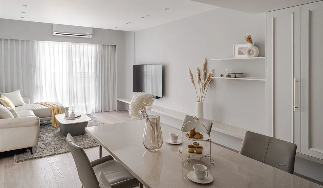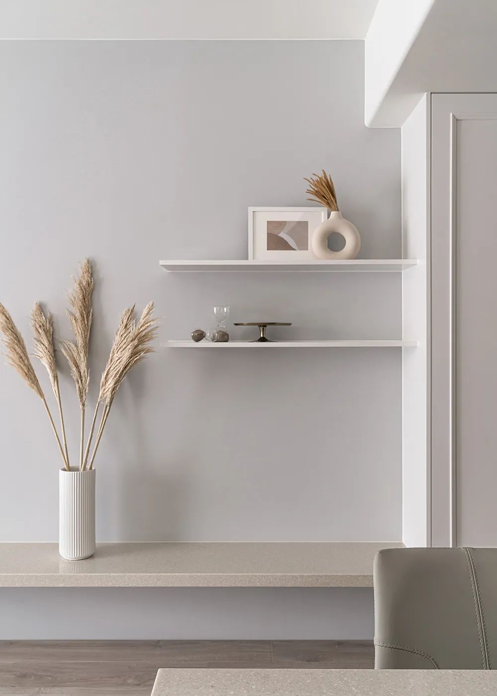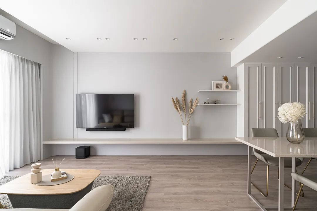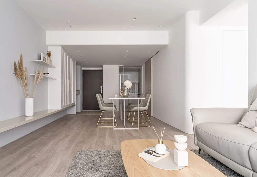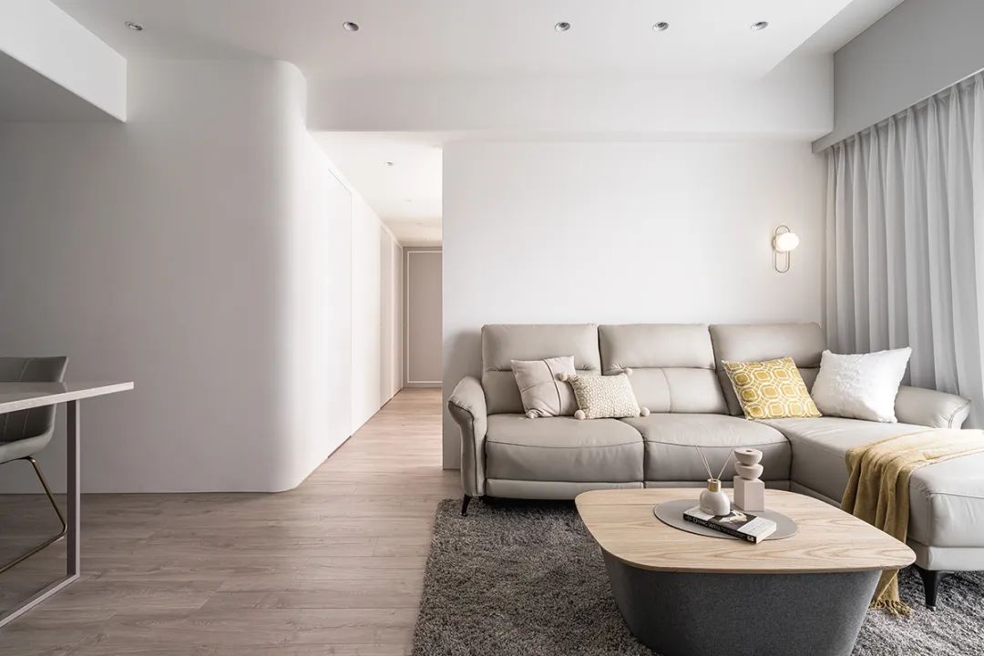 沙发背墙跳脱柔灰,以纯白推进后续格局