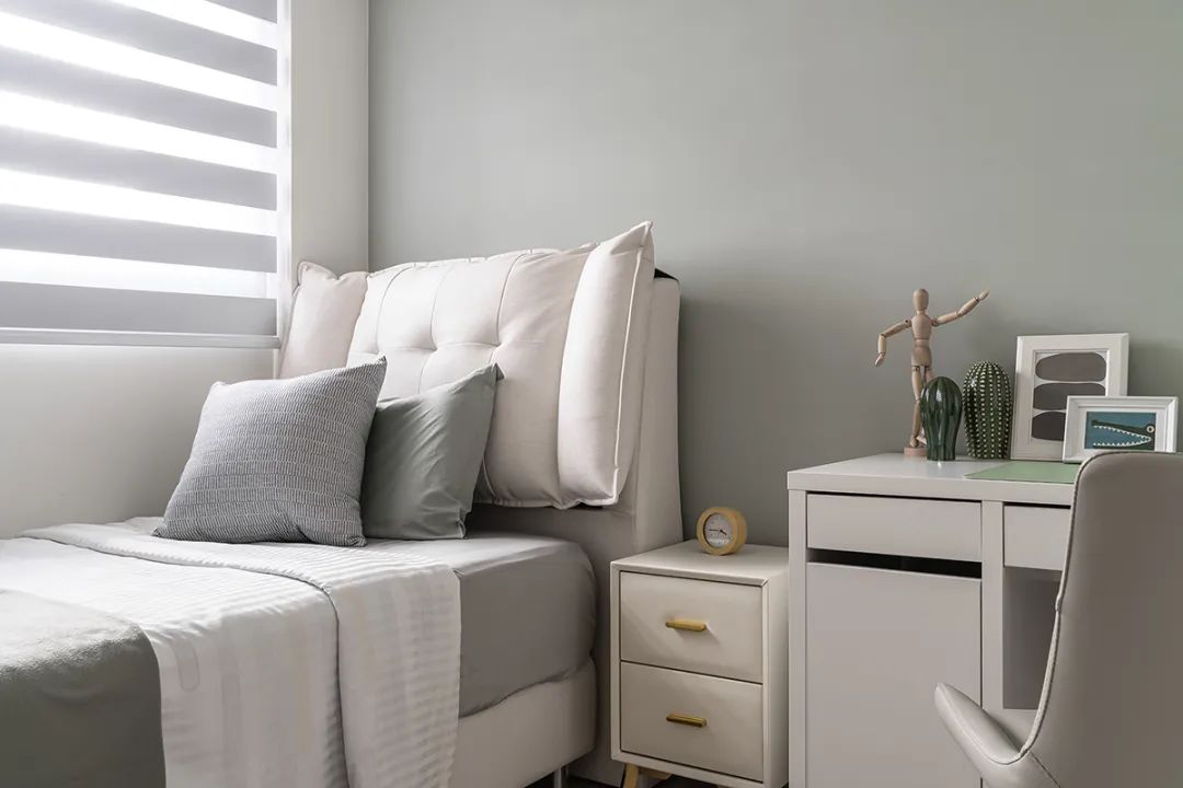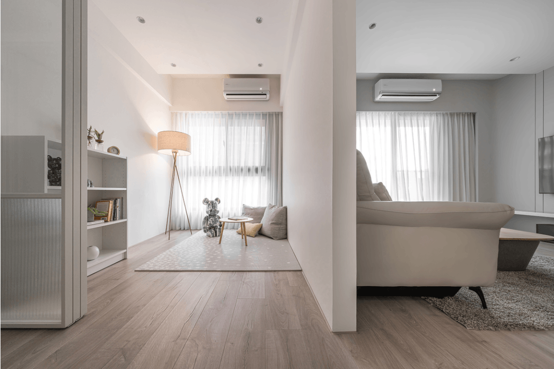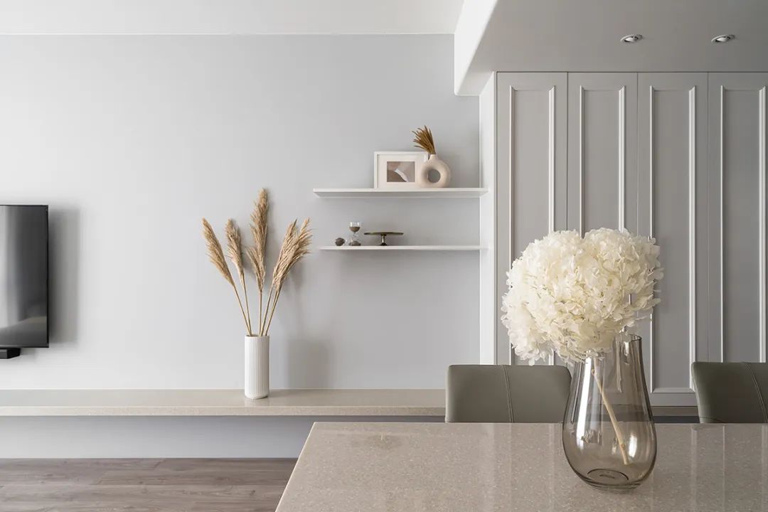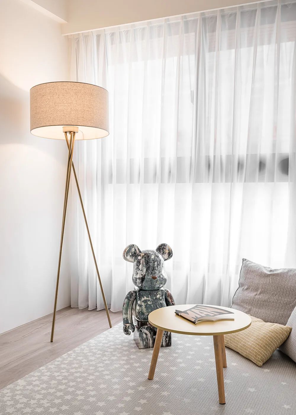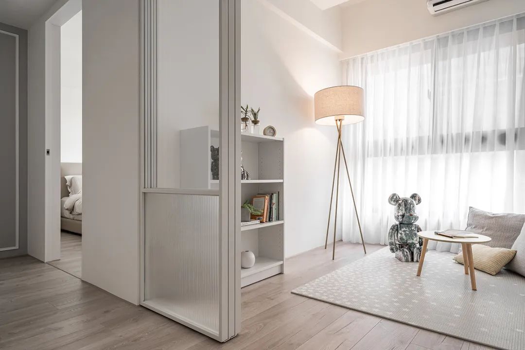 沙发背墙跳脱柔灰,以纯白推进后续格局