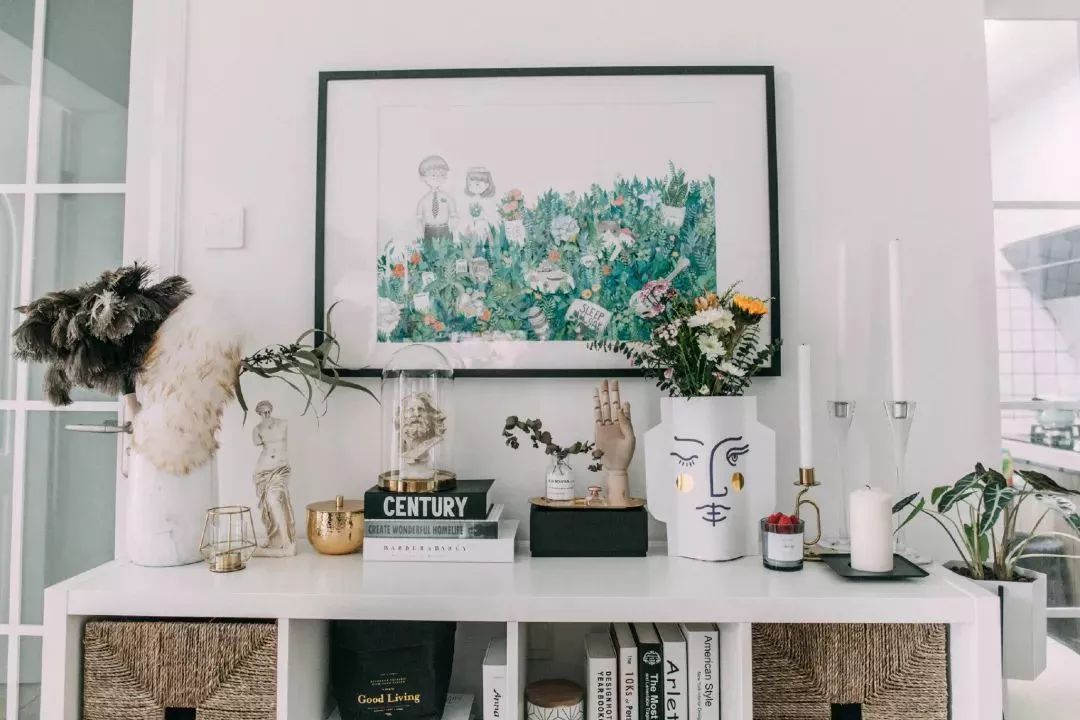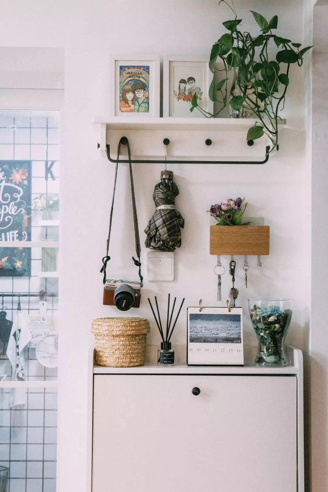 小小的玄关由一个白色的玄关柜和搁架组成,上面放置了一些出门必备小物,再搭配具有装饰效果的插画、绿植以及香薰,渲染出浓浓的文艺气息。