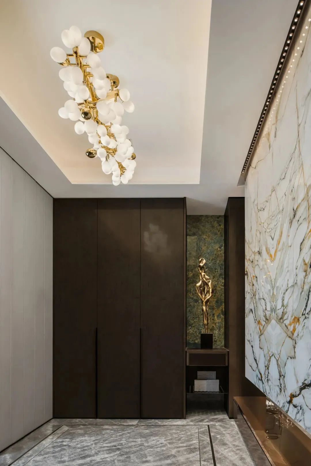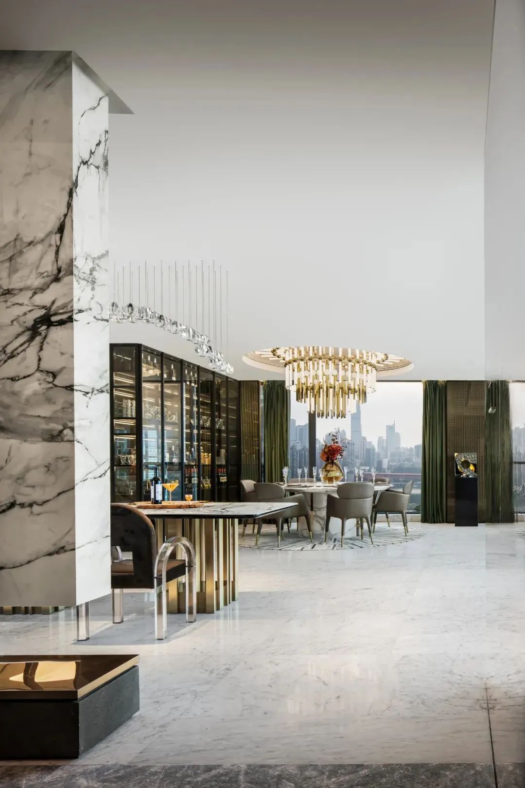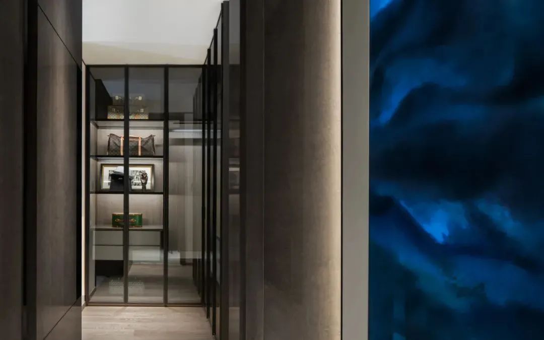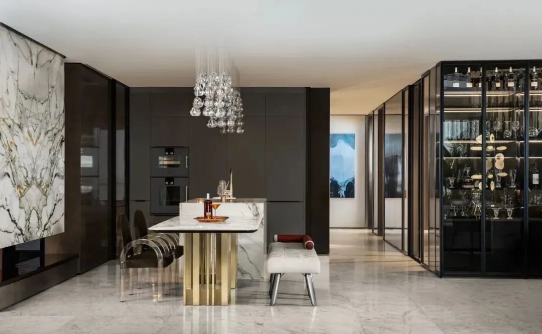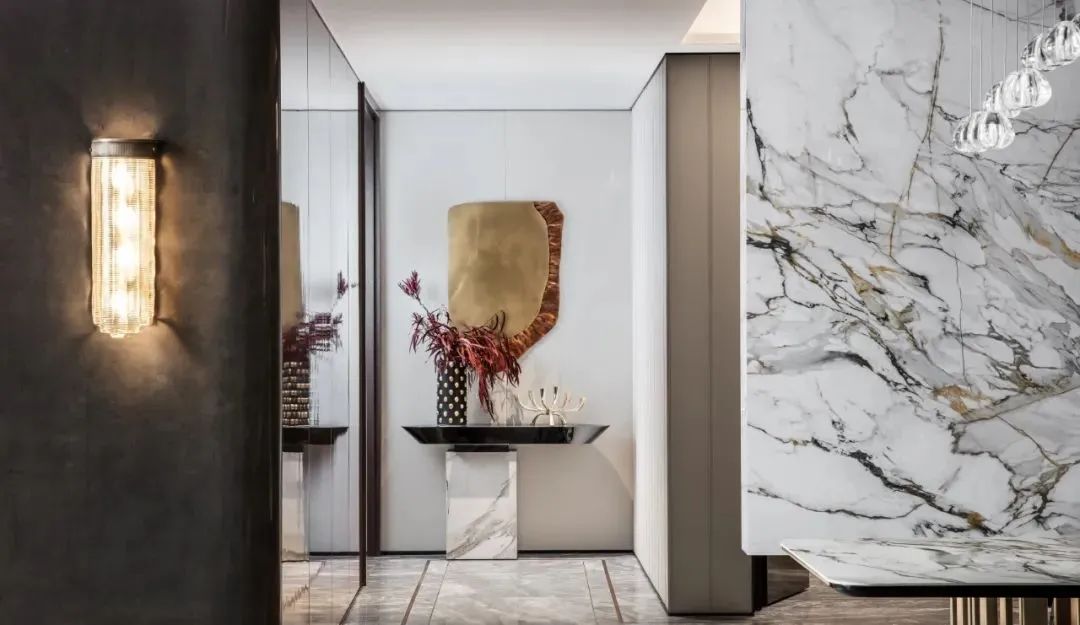 来到会客厅,吸引目光的便是那充满花纹的大块岩石,金色与黑色相互交织,瞬间将空间变得大气高档,灰色调的亚马逊绿色设计的鞋帽柜,搭配着金属色的装置,显得沉稳、低调,富有时尚感。客厅空间宽阔,站立在大面积的落地窗旁,能够看到城市美景,享受着美景带来的轻松愉悦感。