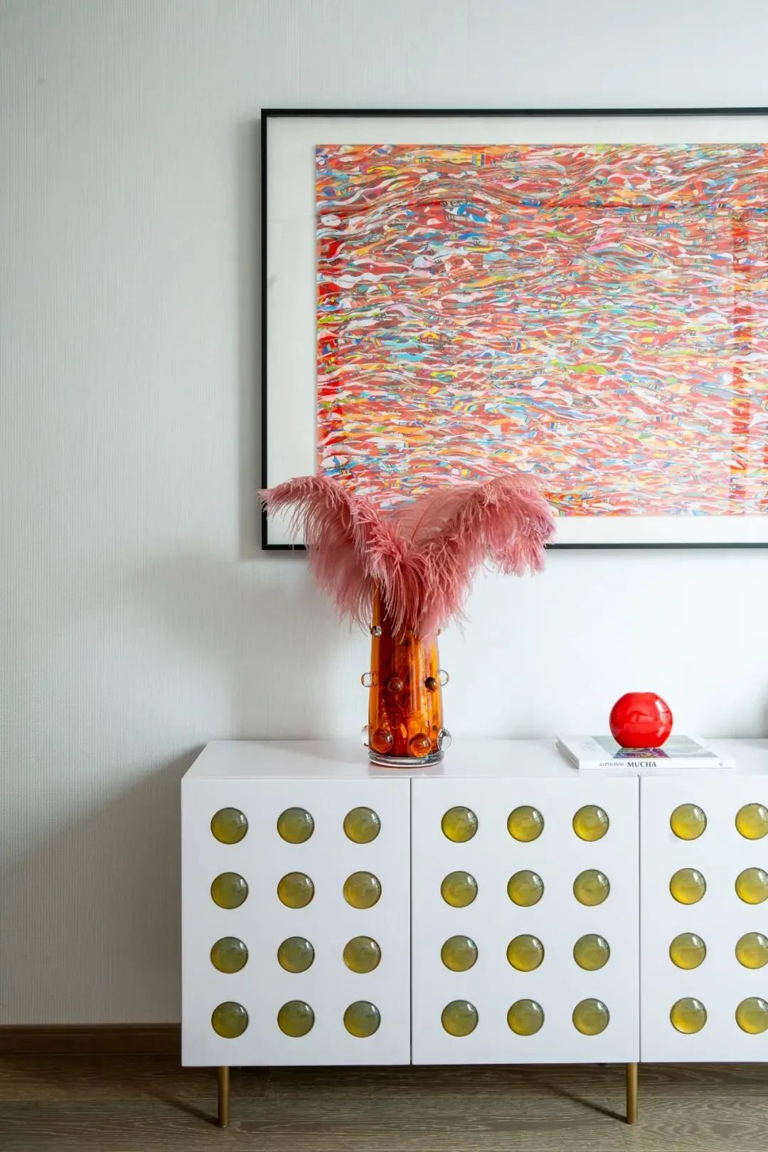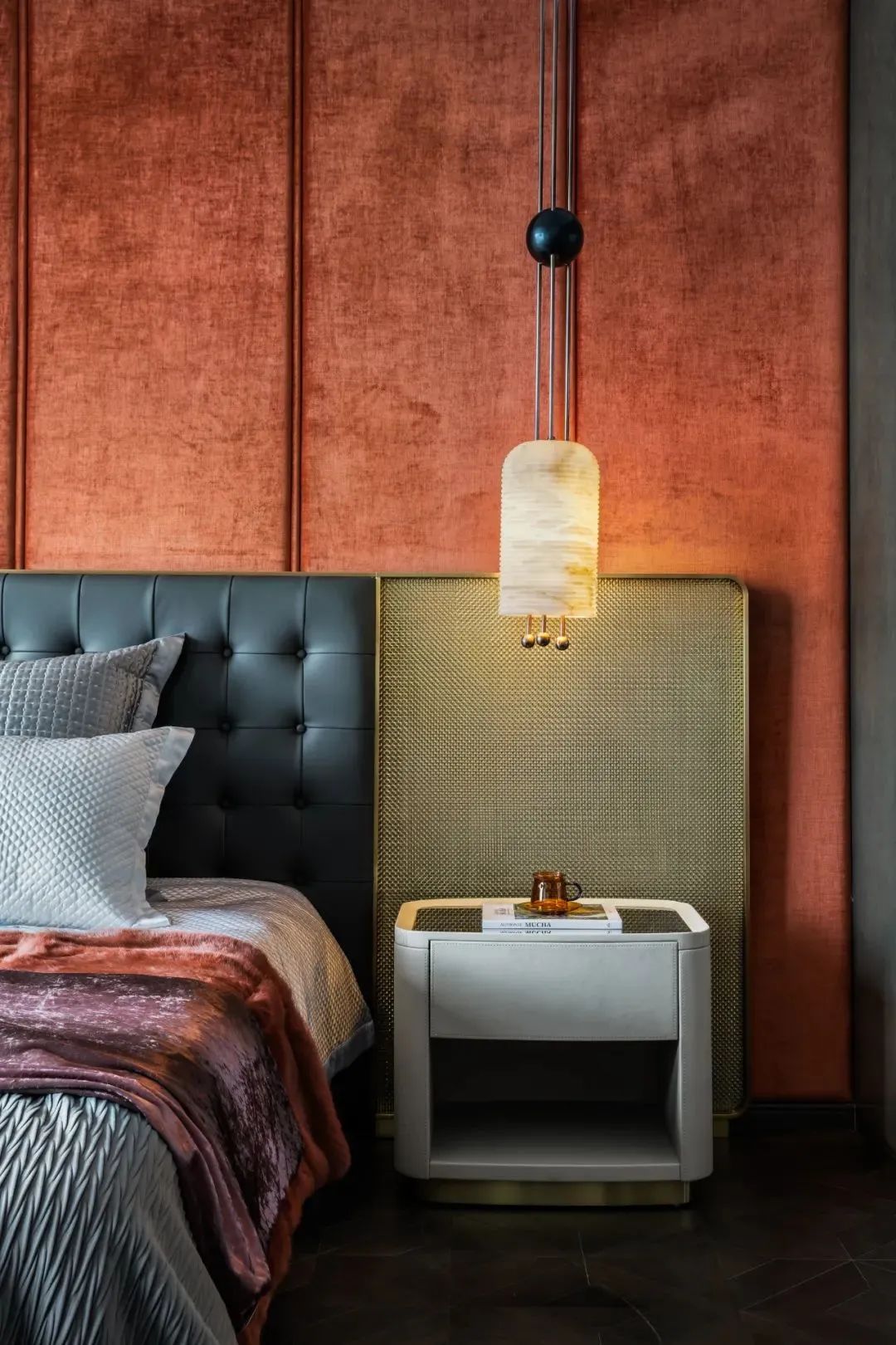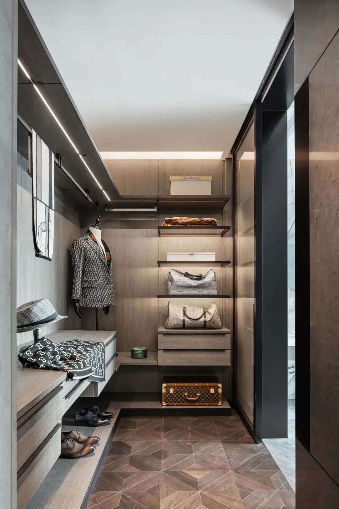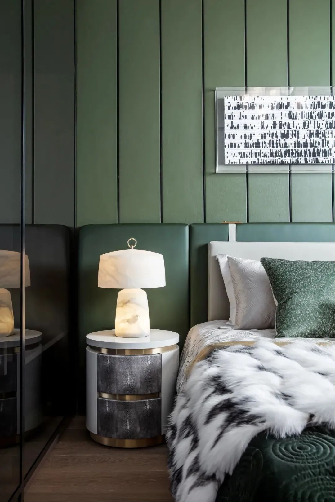来到会客厅,吸引目光的便是那充满花纹的大块岩石,金色与黑色相互交织,瞬间将空间变得大气高档,灰色调的亚马逊绿色设计的鞋帽柜,搭配着金属色的装置,显得沉稳、低调,富有时尚感。客厅空间宽阔,站立在大面积的落地窗旁,能够看到城市美景,享受着美景带来的轻松愉悦感。