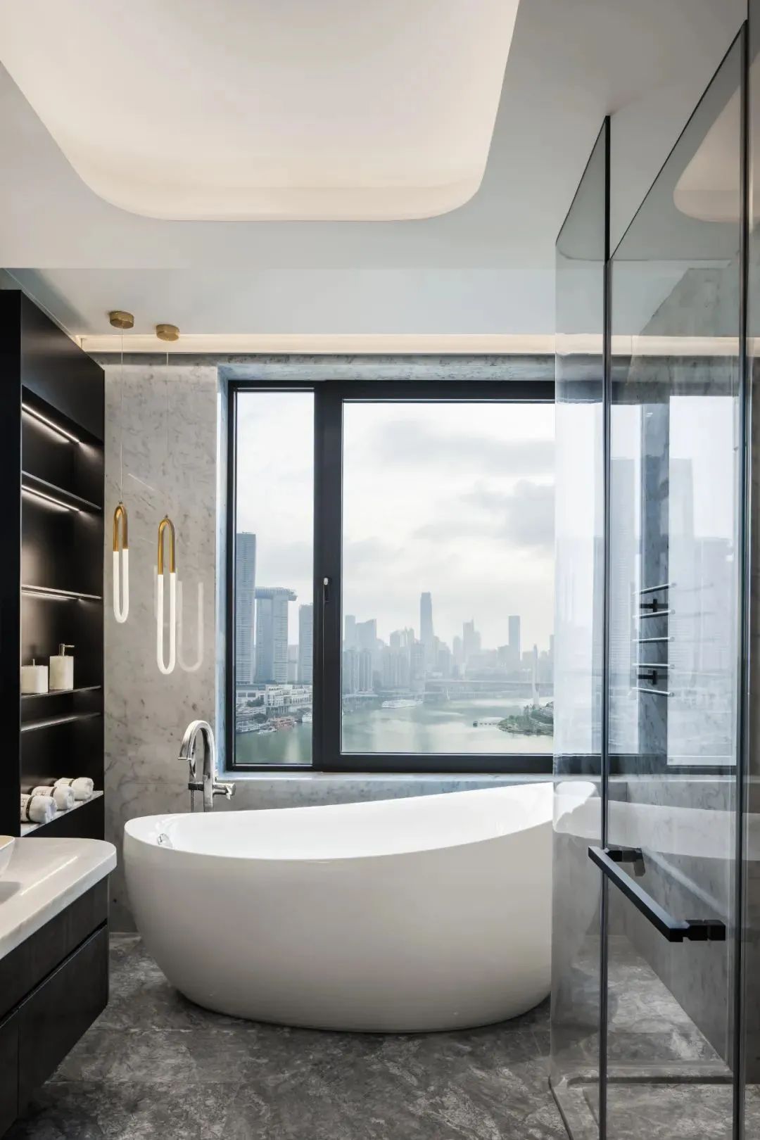 这栋江景豪宅,仔细考究每一处的细节,放大来看,则又能发现别具一格的美,对空间进行极致的规划,让每个功能区呈现出不一样的美感,大气精致的落地窗设计,将重庆CBD美景尽收眼底。