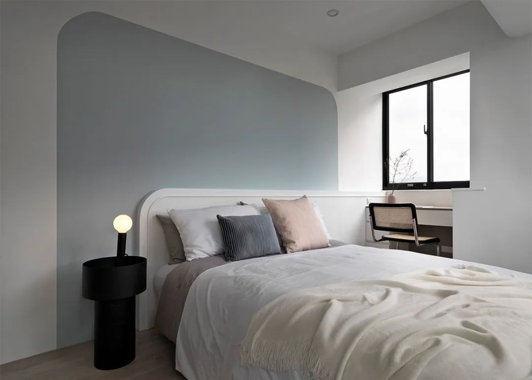 采取隐而不显的手法,隐藏线性灯条为床头照明