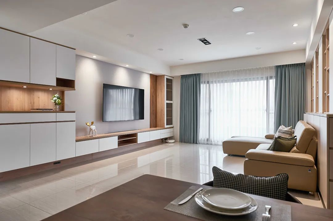 于沙发背墙,打造一大面积连续柜体
