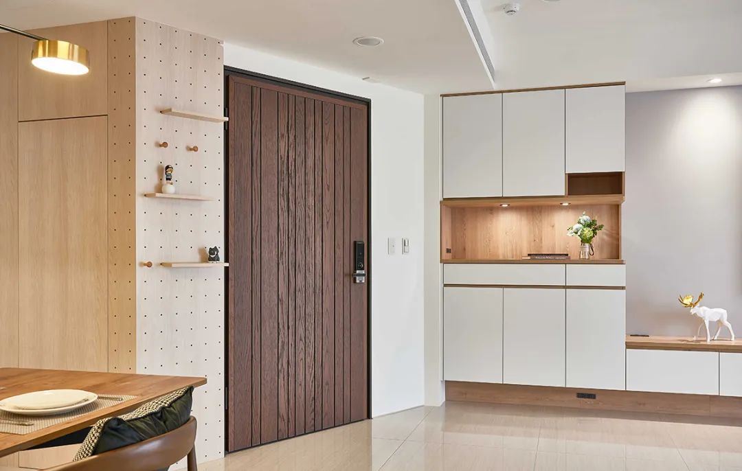 以整侧壁面浅木纹洞洞板为随手挂衣置物处