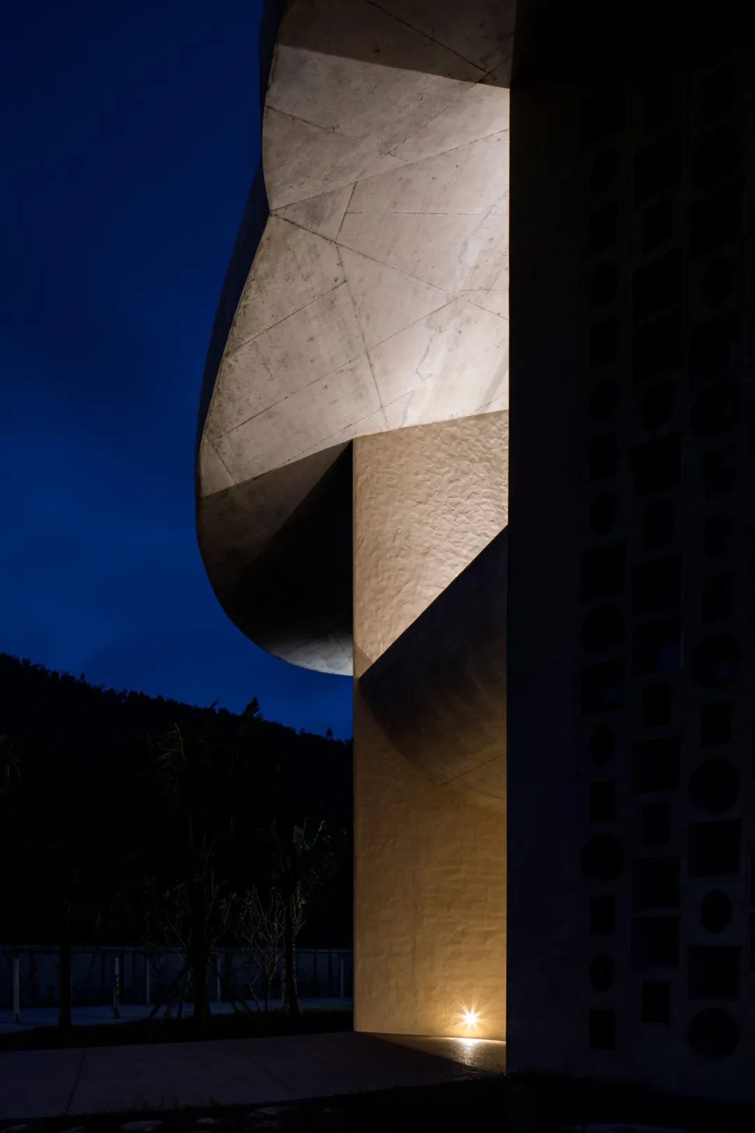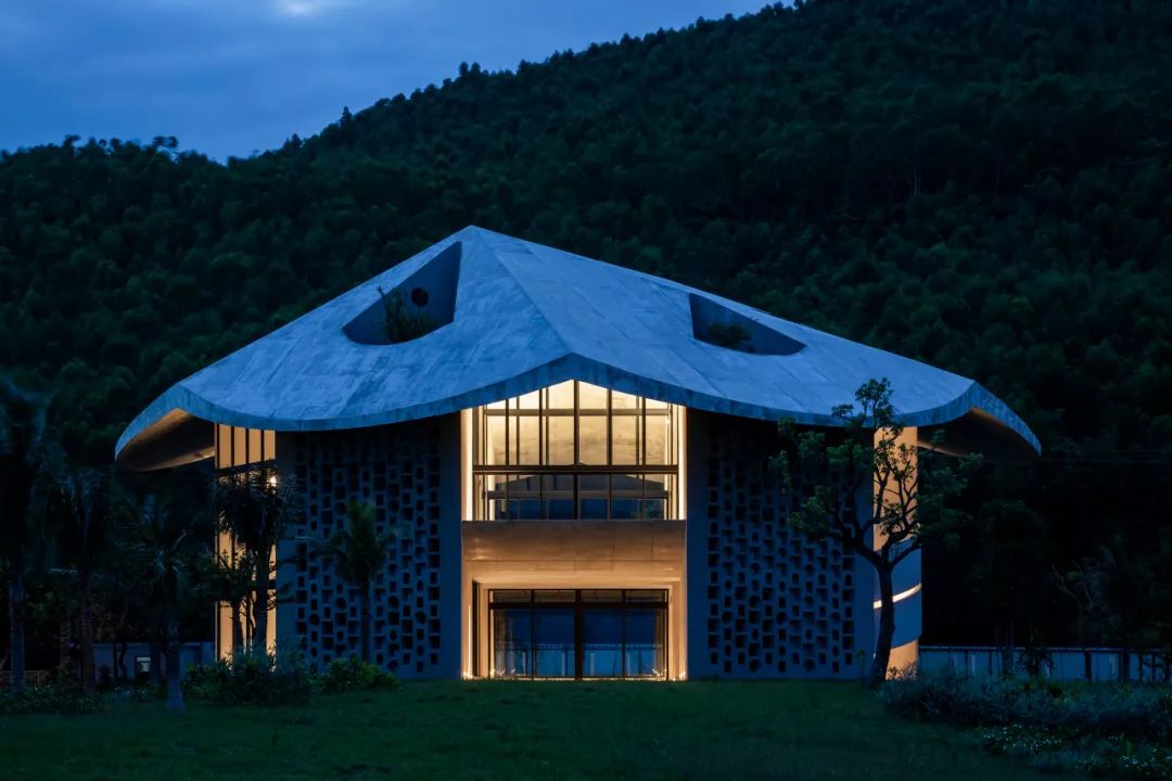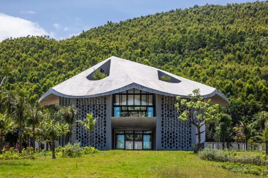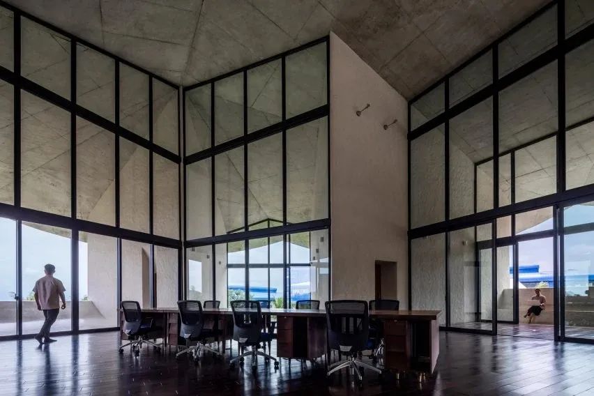 建筑公司 Inrestudio为越南广平省的一家矿业公司建造了一座办公和住宅楼,其特点是锥形混凝土屋顶和四面八方的开口。
