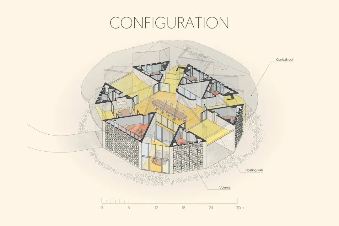 万花筒有一个混凝土结构,顶部有一个巨大的圆锥形屋顶,设计类似于 nón lá - 一种传统上由农民佩戴的越南帽子。