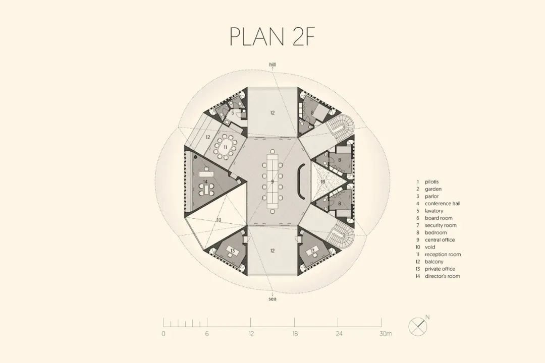 Inrestudio 将万花筒的平面图设计为一系列三角形的房间,这些房间向外开放,内部狭窄。它们围绕着一楼的开放空间和上方的海绵状中央办公室。