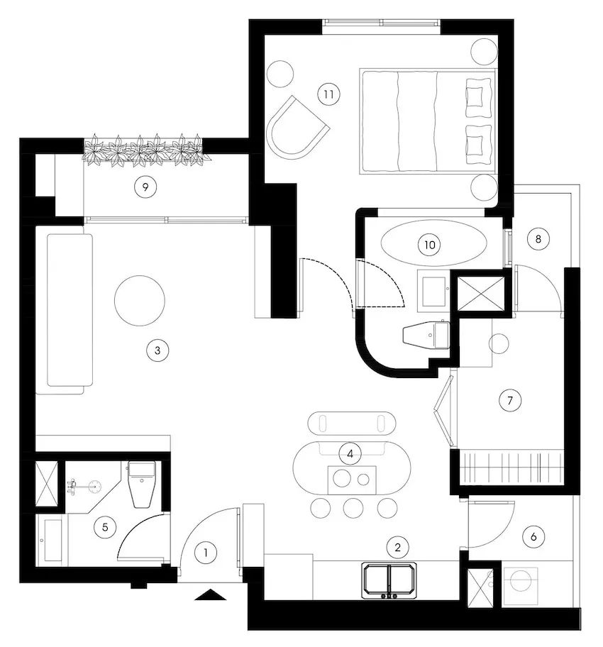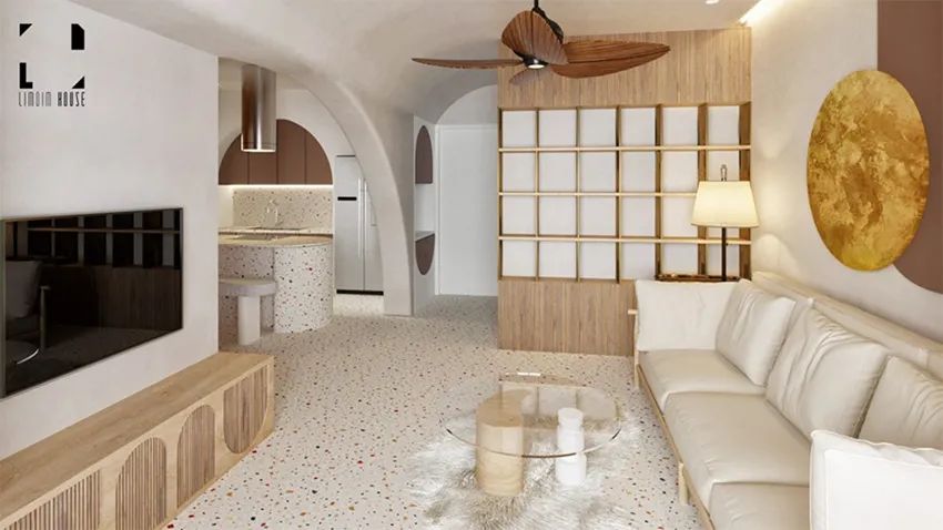 敞开宽敞客厅与餐厨区,并添入一弯圆拱弧形