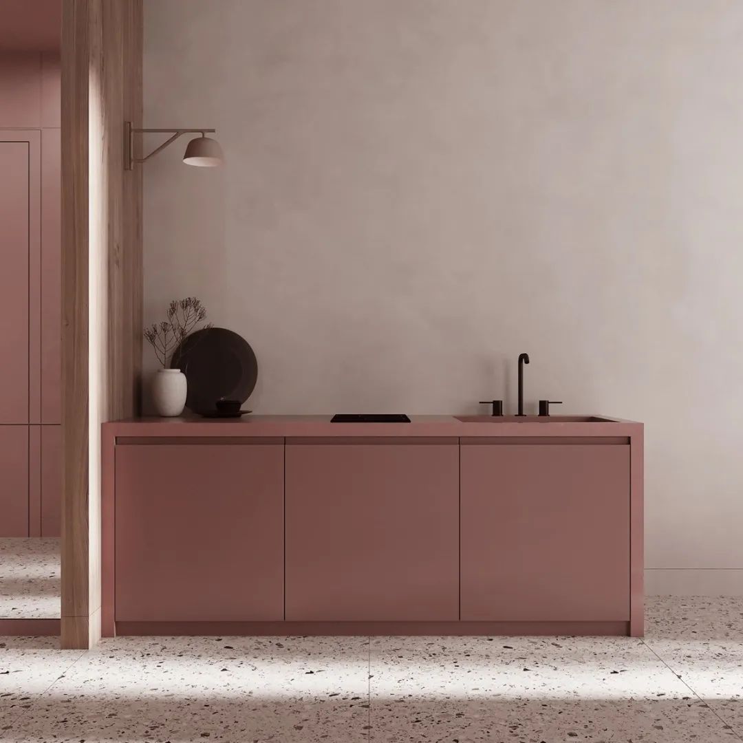 浅色木纹橱柜门与粉红色的家居装饰色调柔和