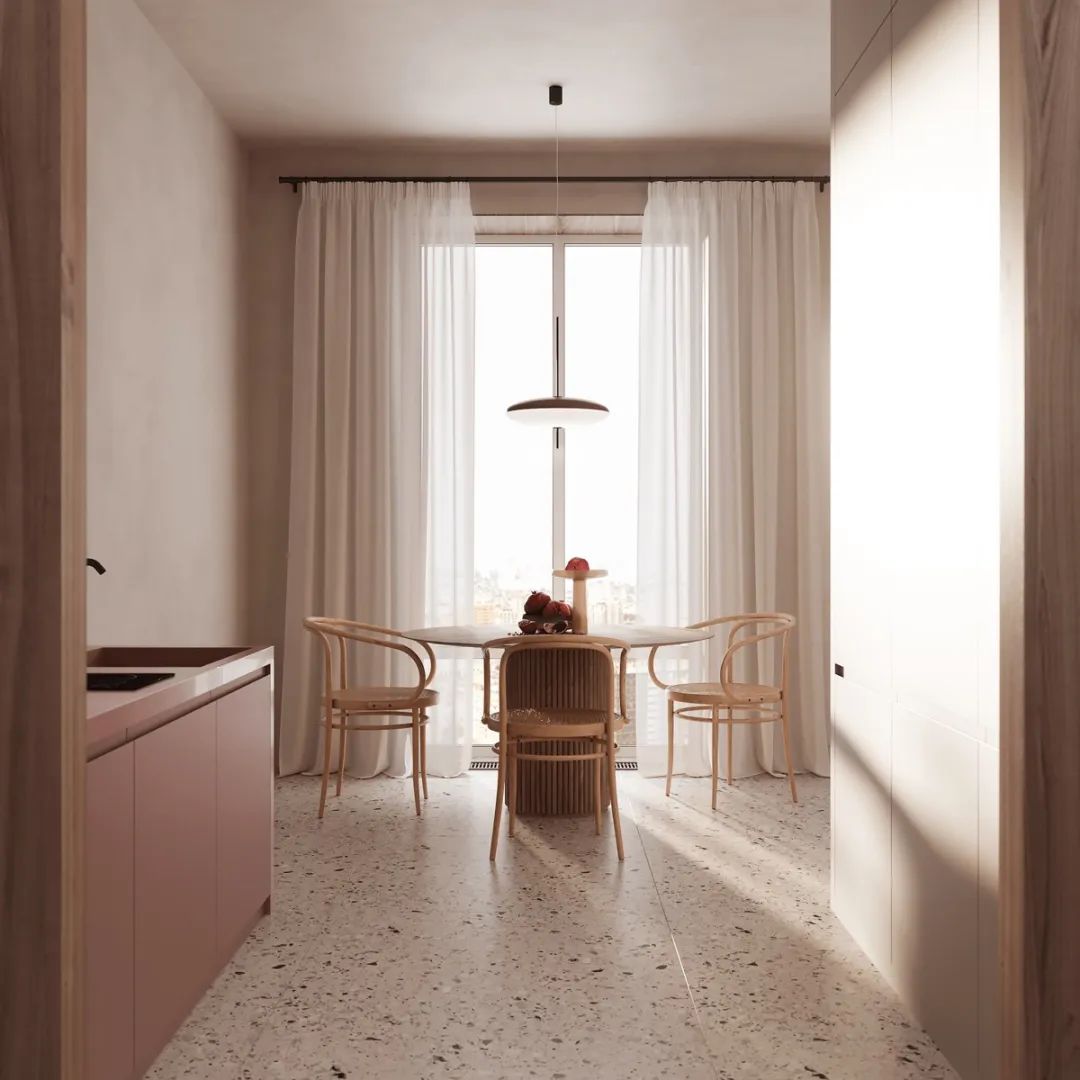 一盏雅致的粉色餐厅吊灯挂在阳台门前
