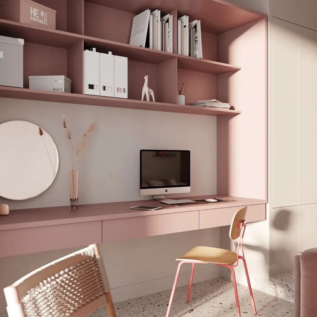 粉红色和木质的桌椅可以轻松地在两个任务区域之间移动