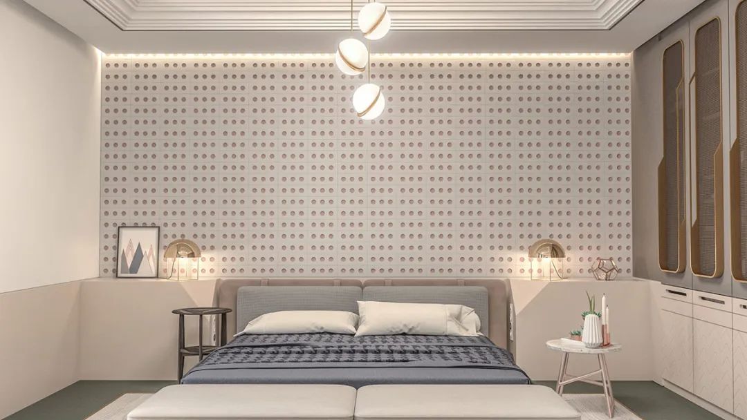 更多的金色点缀在床上的球形吊灯周围闪闪发光